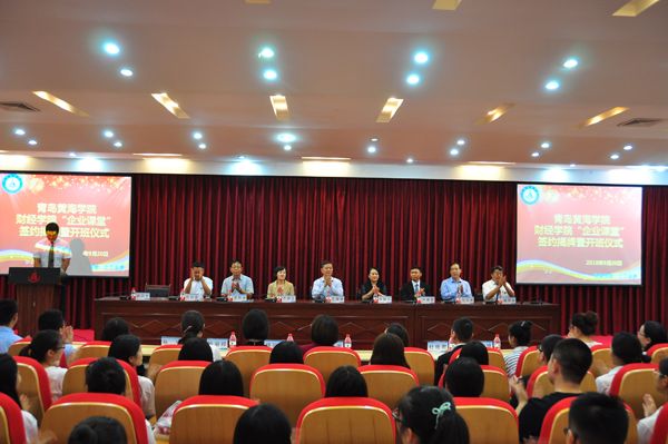 9月20日,财经学院企业课堂签约揭牌暨开班仪式在知新楼西会议室隆重举行。青岛鼎力会计师事务所所长李丽兰、安踏集团青岛分公司总经理刘道春、招商证券股份有限公司青岛西海岸新区分公司总经理高建云;我校校长王渊明、副校长梁希泉、纪委书记马永来、教务处长郭启连以及财经学院院长杨荣本等出席仪式,2015级财务管理专业本科班近300名同学一并参加此次活动。会议由财经学院常务副院长赵国光主持。