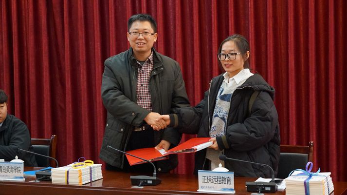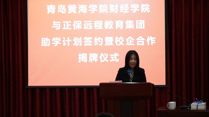 随后,正保远程教育集团校园业务部总监申燕瑞与我校财经学院副院长孙在福双方签署了助学协议,正保远程教育集团校企合作经理曹波与青岛黄海学院副校长梁忠环为本次“产学研合作基地”的建立进行揭牌。最后,正保远程教育集团向财经学院师生赠送网课2573份,图书1269册,作为大学生助学计划开展的第一步,并进行了赠书仪式。