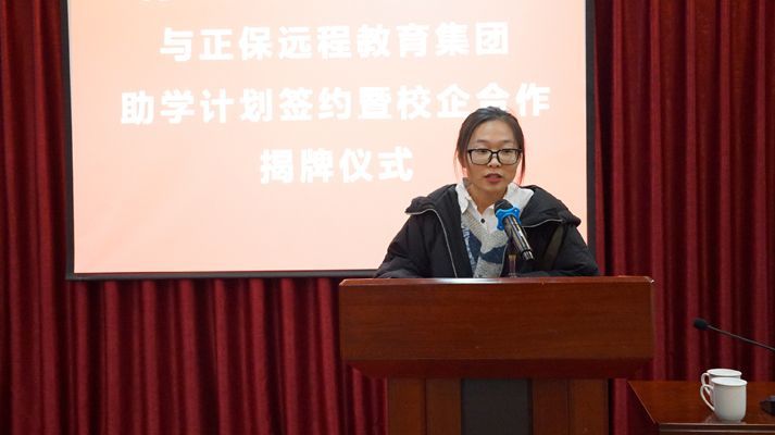 12月28日下午,我校财经学院与正保远程教育集团助学计划签约曁校企合作揭牌仪式在知新楼西报告厅隆重举行。学校副校长梁忠环、财经学院常务副院长孙在福、正保远程教育集团线上校园市场总监兼高级职业规划导师张时赫、正保远程教育集团校园业务部总监申燕瑞、正保远程教育集团校企合作经理曹波等出席活动。财经学院各教研室主任、部分教师及学生代表参加揭牌仪式。活动由财经学院副院长张永彬主持。