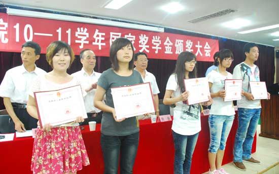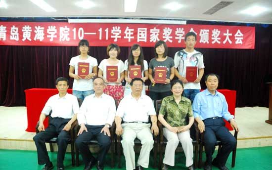 大会由办公室魏副主任主持。首先,由院党委副书记宋庆泽代表学院宣读青岛黄海学院《关于公布2010-2011学年度国家奖学金、国家励志奖学金获奖学生名单的决定》和获奖学生的名单——安文豪等5人获得国家奖学金,每人8000元;姜雷等217人获得国家励志奖学金,每人5000元;此外还有981人获得国家助学金,平均每人3000元。随后,学院领导为国家奖学金获得者代表颁发了荣誉证书,获奖代表张楠楠、王希航同学发表获奖感言。