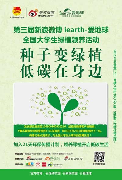 5月23日,由校学生会承办的“全国大学生第三届新浪微博iearth-爱地球全国大学生绿植领养”活动青岛黄海学院站,在我校一号公寓楼旁公告栏处举行。