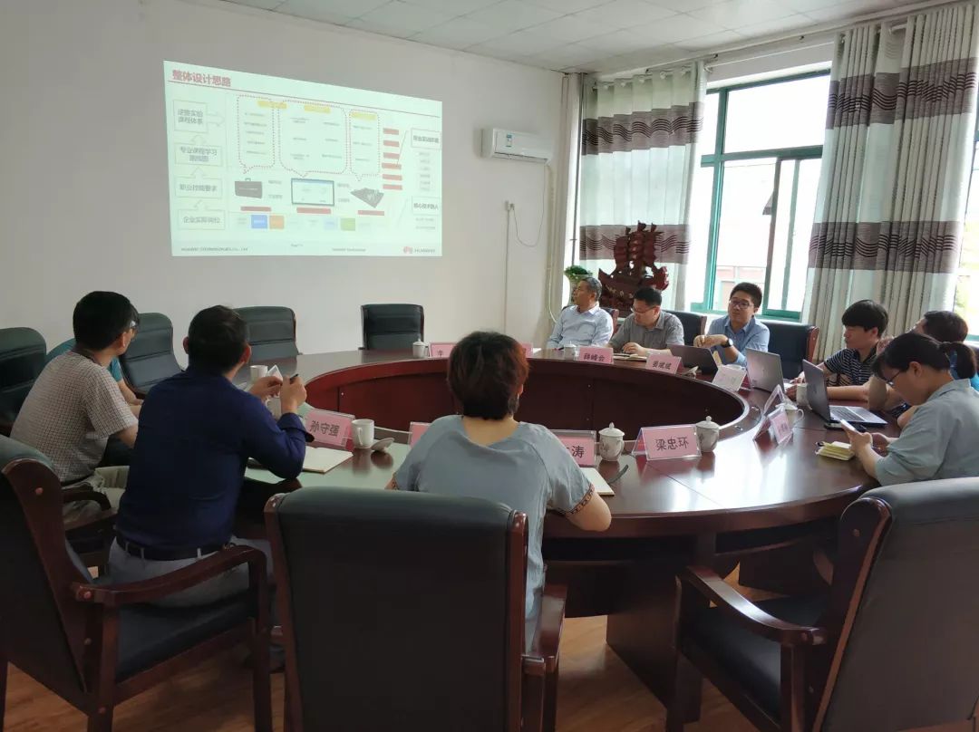 尹成波副院长对孙总一行的到来表示热烈的欢迎,陪同观看了学校宣传片并详细介绍了大数据学院的基本情况和未来的发展方向。孙总对学校的发展和大数据学院的定位给予了高度的赞誉,非常愿意将华为的成熟培训体系和技术融入到黄海学院,并帮助大数据学院教师赋能,尽快提高教师专业能力。华为教育解决方案产品经理姜斌斌就大数据、物联网、人工智能的人才培养目标和课程体系设置做了详细的介绍,重点对我校数据科学与大数据技术的人才培养方向和课程设置做了详细的规划,按照就业岗位划分了课程,使得课程地图更加的清晰,对我们专业的建设和发展指明了更清晰的发展方向。随后,华为各位领导与我院10位专业教师进行了深度交流,老师们从目前网络安全、数据库技术发展、物联网专业申报等方面提出自己的看法和需求,华为领导们给予了专业的技术指导和解惑答疑。