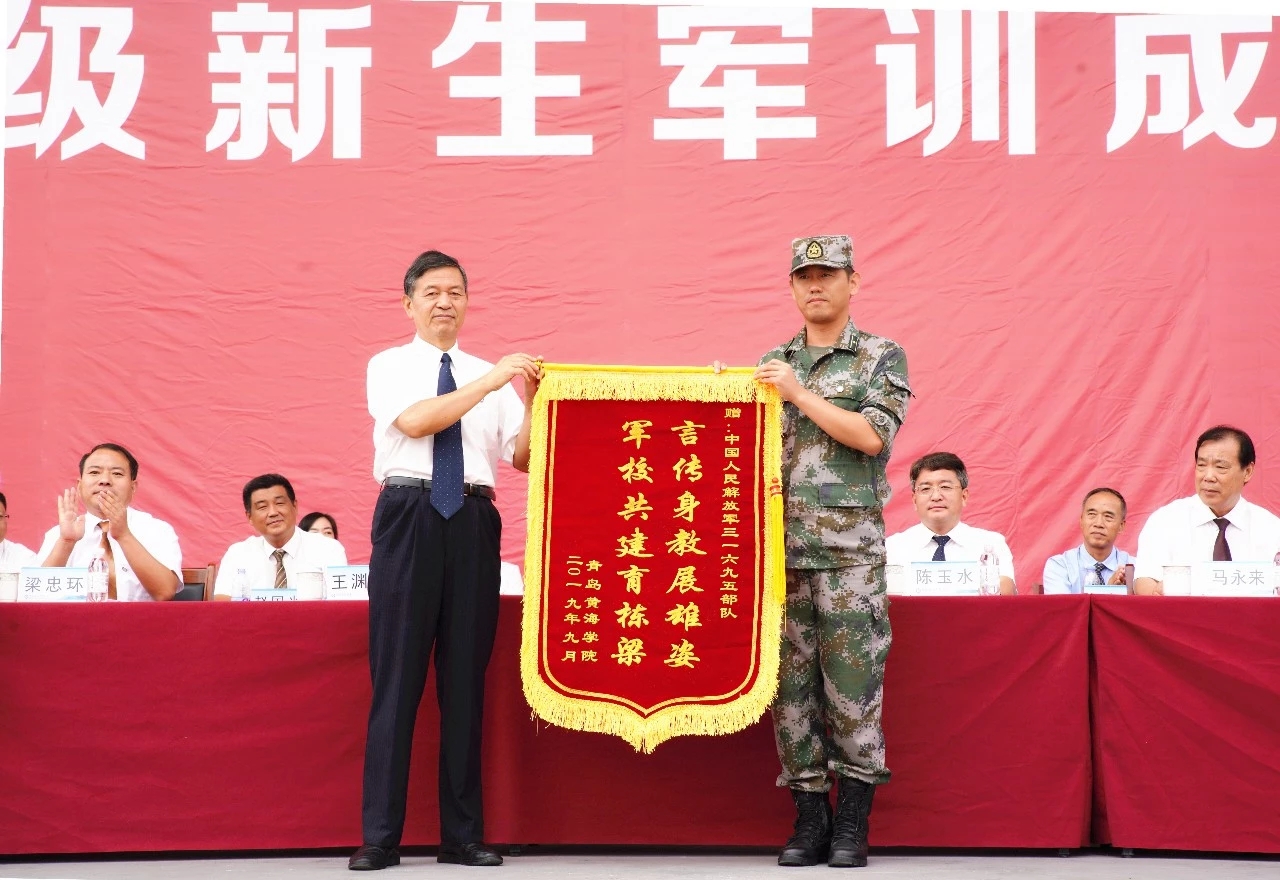 随后,新生代表护理与健康学院林树森同学表达了对部队教官的衷心感激和崇高敬意,感谢教官们的悉心教导和无私付出。王渊明校长代表学校向承训部队赠送锦旗,向所有承训部队教官表达最诚挚的谢意。