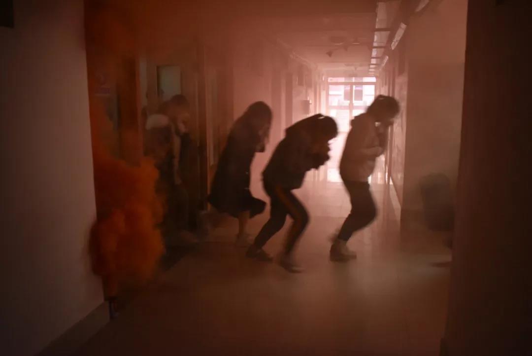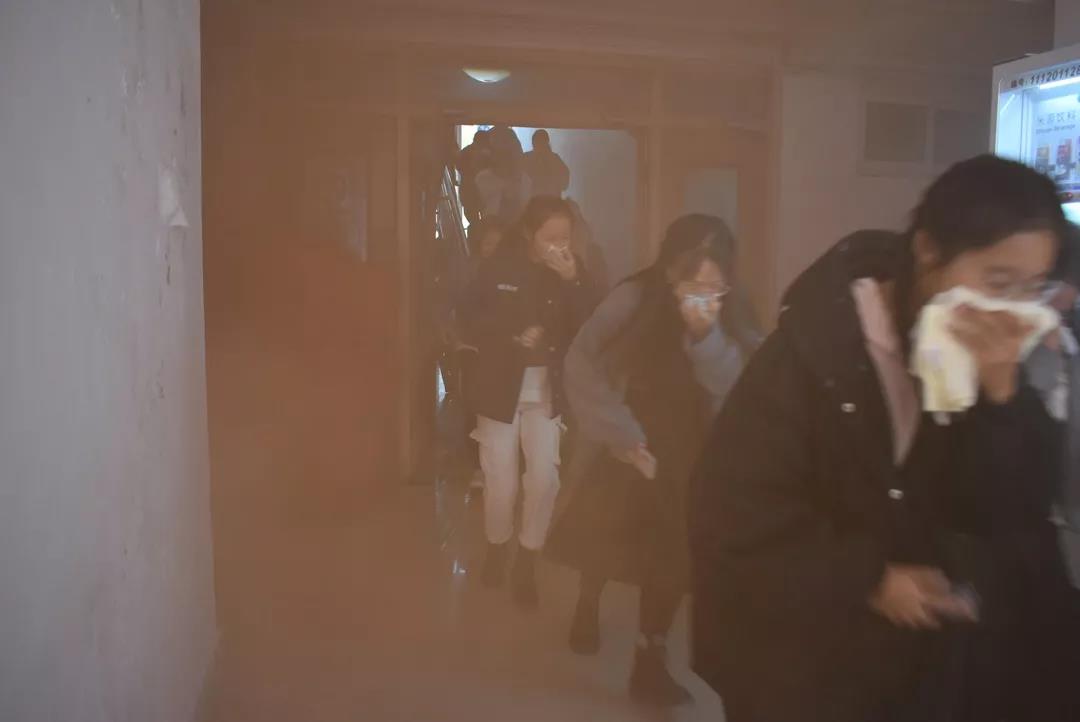 随着一阵急促的警报声响起,拉开了此次活动的帷幕。学生会成员和负责老师迅速到达指定岗位指导学生快速疏散,各位同学弯着腰,捂住鼻口,沿着紧急逃生路线快速前进,有序撤离到指定位置。到达安全位置后,女生宿舍负责人齐文彬老师对同学们行、