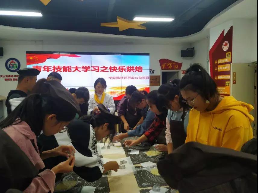 2019年11月17日下午两点国际商学院志愿者协会在万达公馆A区学院路党群服务中心组织了青年技能大学习之快乐烘焙活动。