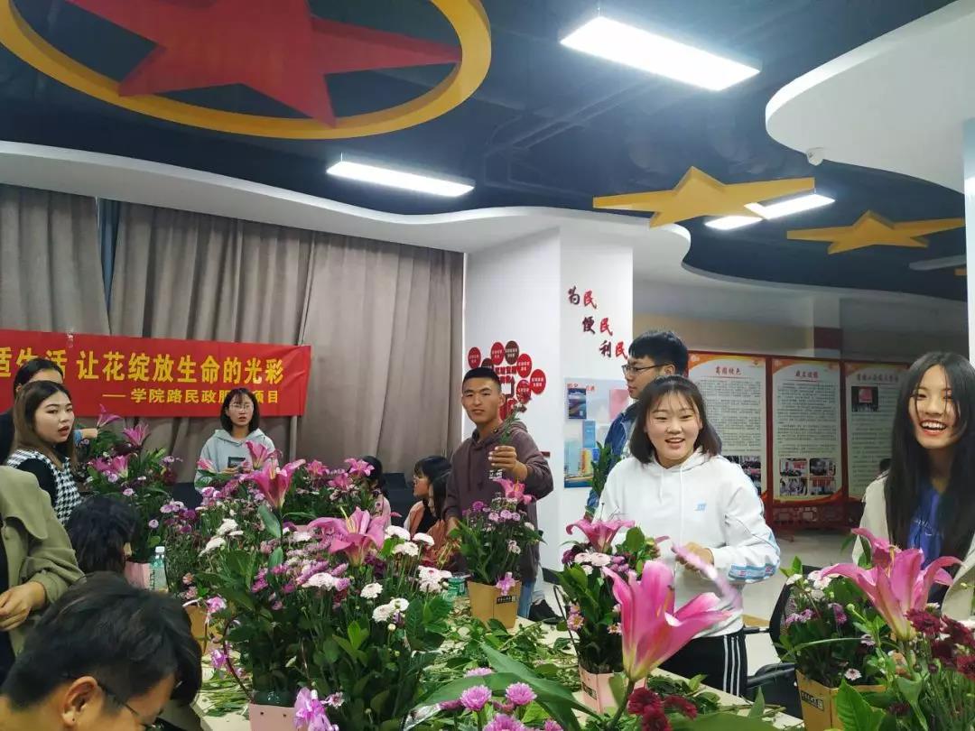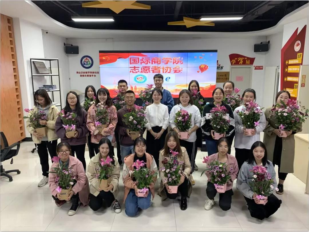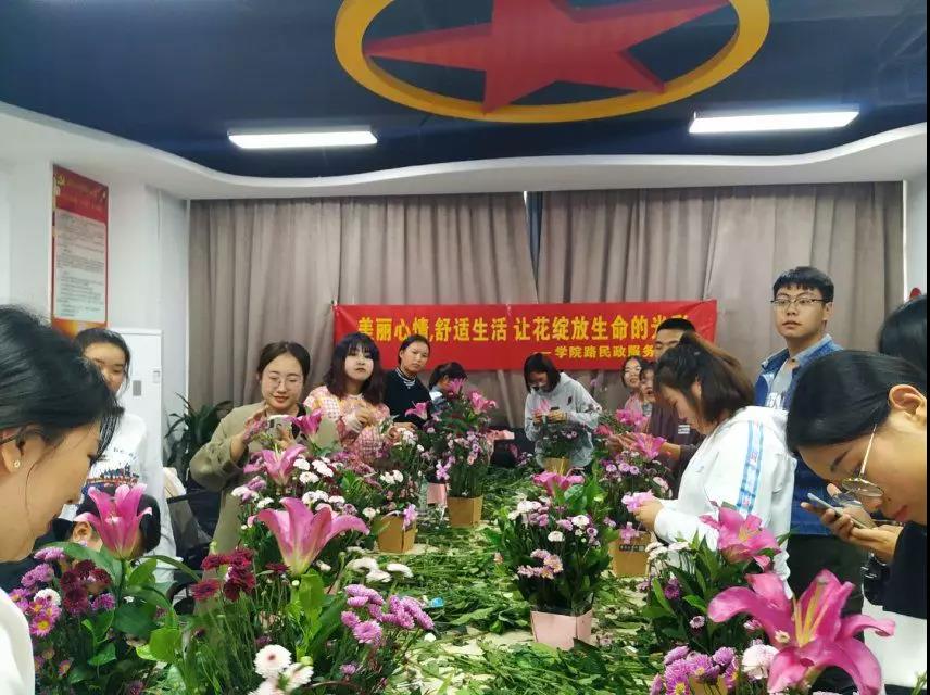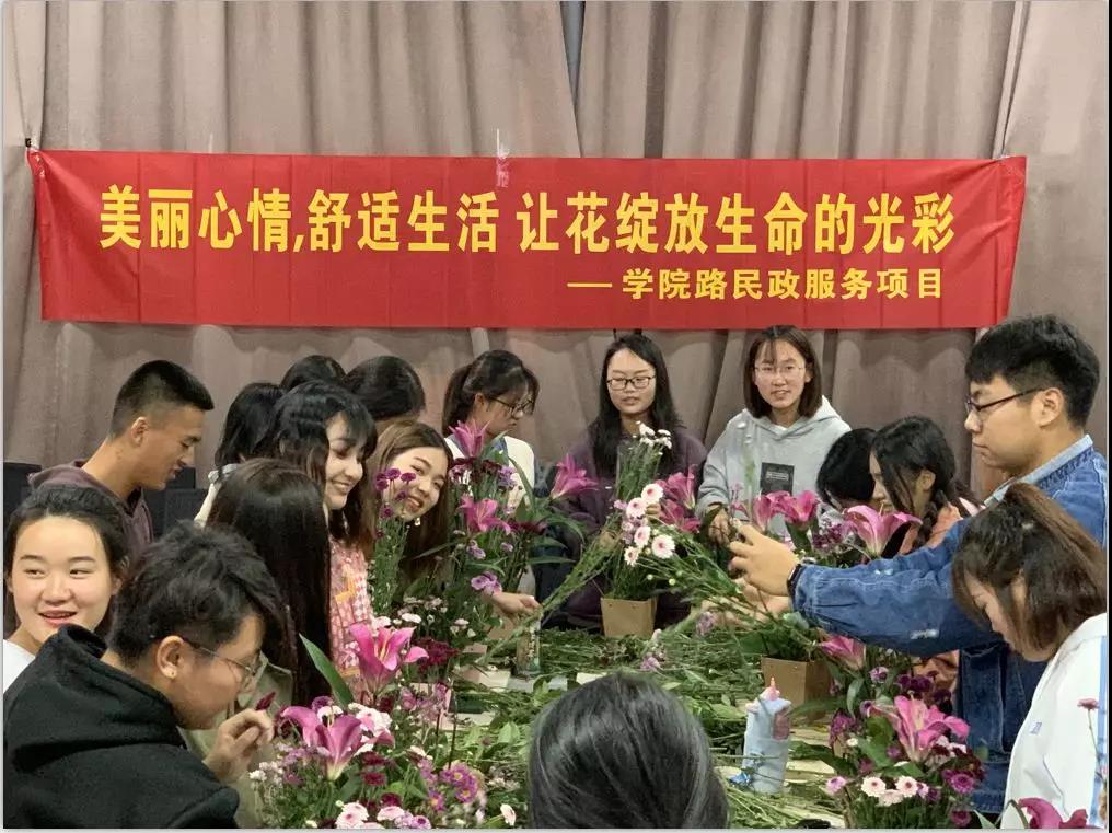 2019年11月16日国际商学院志愿者协会在万达公馆A区开学院路党群服务中心组织了一场初冬欢聚插花献祖国的活动。