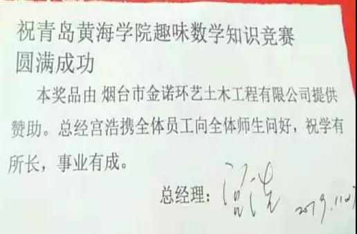 最后,迈思数学协会“趣味数学第七届知识竞赛”圆满结束,衷心感谢烟台市金诺环艺土木工程有限公司对本次活动的赞助。对获奖的同学表示热烈祝贺,没获奖的同学也不要灰心,你们的付出最终会得到回报。