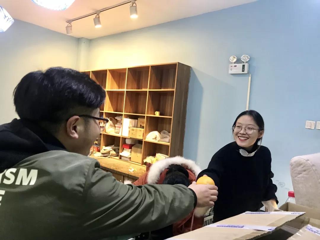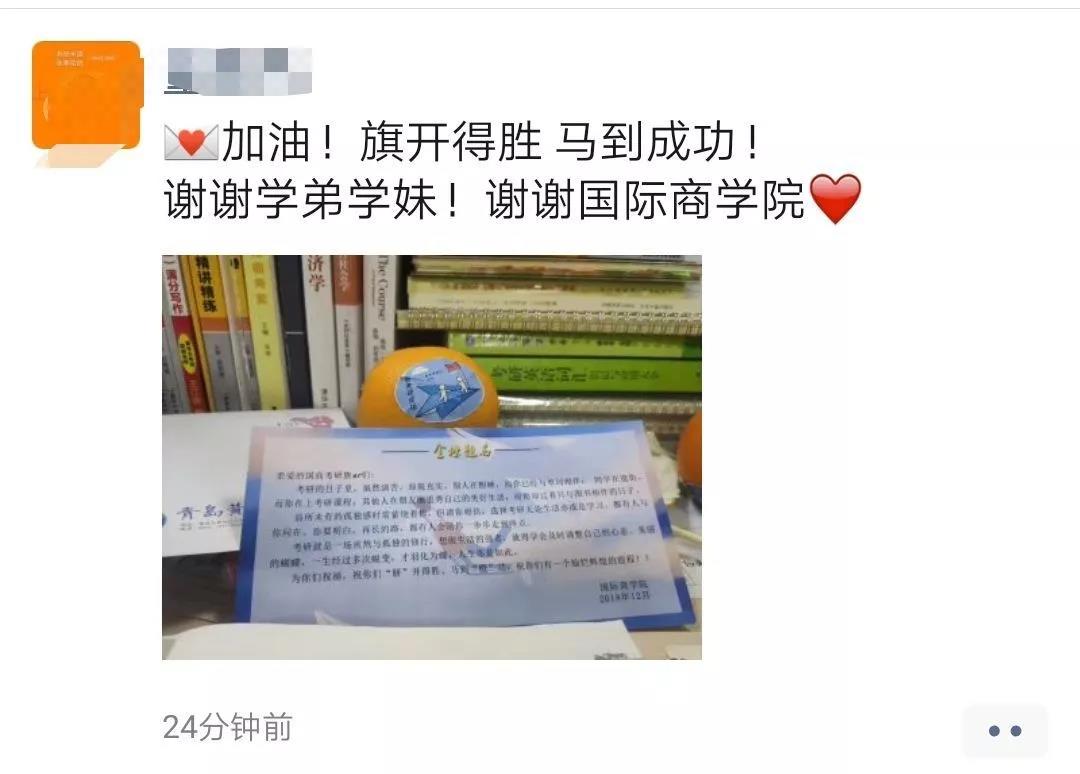 新鲜美味的脐橙,寓意着“脐”开得胜,马到“橙"功。每个橙子上还贴着暖心小贴纸。精致美观的卡片,由国际商学院新媒体中心亲手制作(在这里小e悄悄的为自己手动打call),每张卡片上写满了我们对考研学子们的祝福。