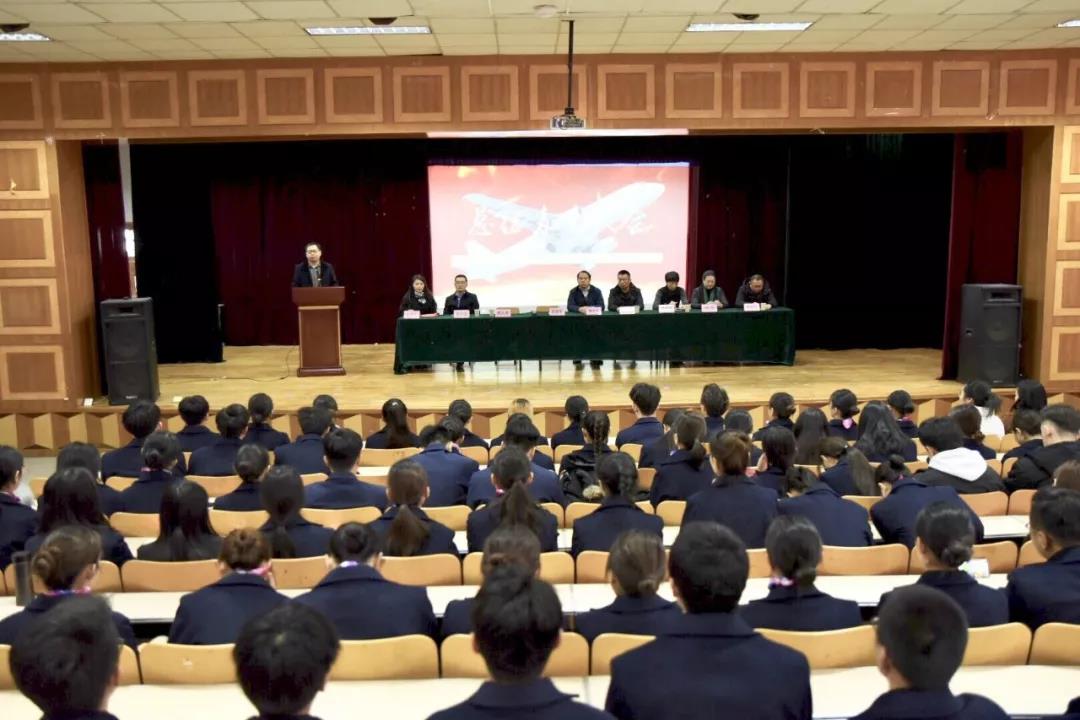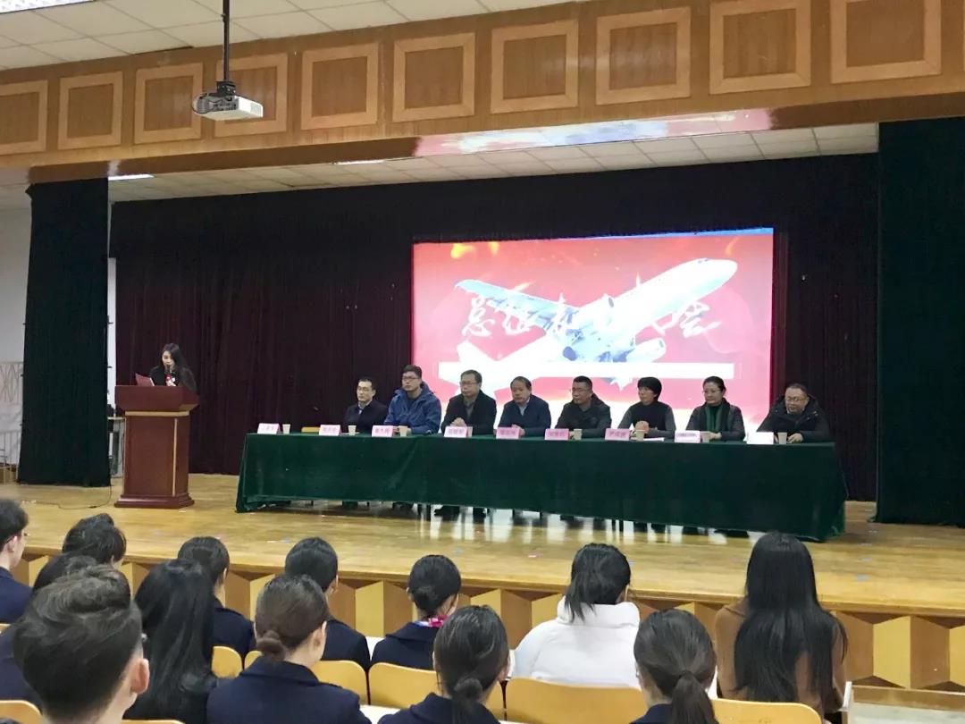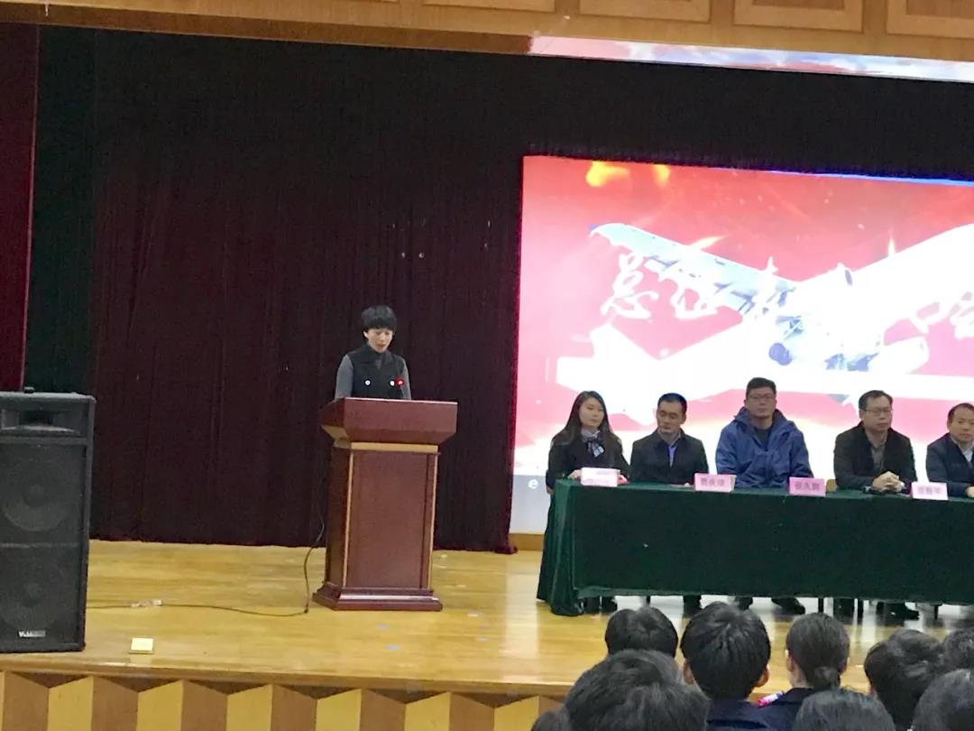 大会进行第五项,由北京华航航空有限公司副总经理温振军发言。温总在发言的最后,引用了“有志者事竟成,破釜沉舟,百二秦关终属楚;苦心人天不负,卧薪尝胆,三千越甲可吞吴。”表示了对同学们的美好祝愿。