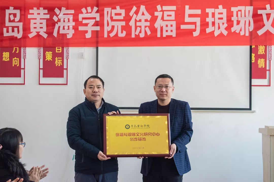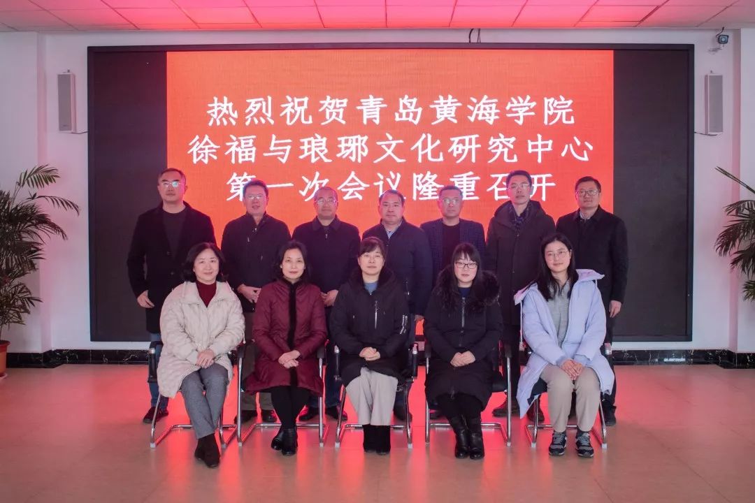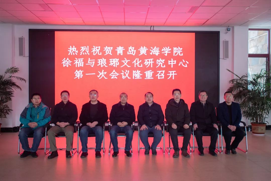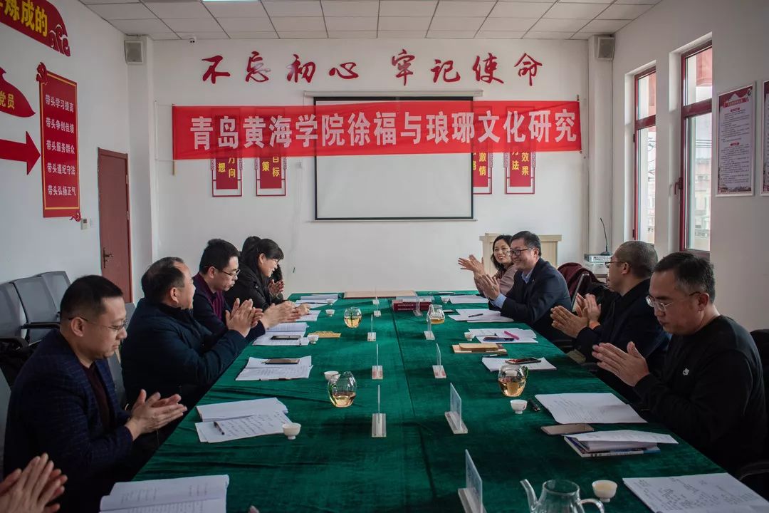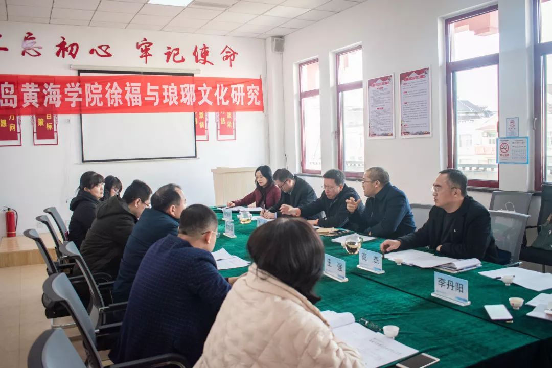 2020年1月11日上午,青岛黄海学院徐福与琅琊文化研究中心第一次会议在琅琊镇王家台后村委会议室举行。会议邀请专家学者共同商讨研究徐福与琅琊文化。会议由研究中心执行主任陈传照主持,邀请到会专家或嘉宾有:琅琊镇王家台后村委书记王强,青岛黄海学院副校长梁忠环,青岛市黄岛区文物考古研究所所长徐忠强,中国孔子研究院礼乐文明中心研究员林桂榛,青岛西海岸诗词楹联协会副主席高杰,山东科技大学艺术学院副教授陈喜红、李忠,青岛黄海学院科研服务部副部长姜宝华、国际商学院副教授贾绪红,青岛启明茶坊创始人兼青岛黄海学院《国学与茶道》主讲教师李丹阳等。