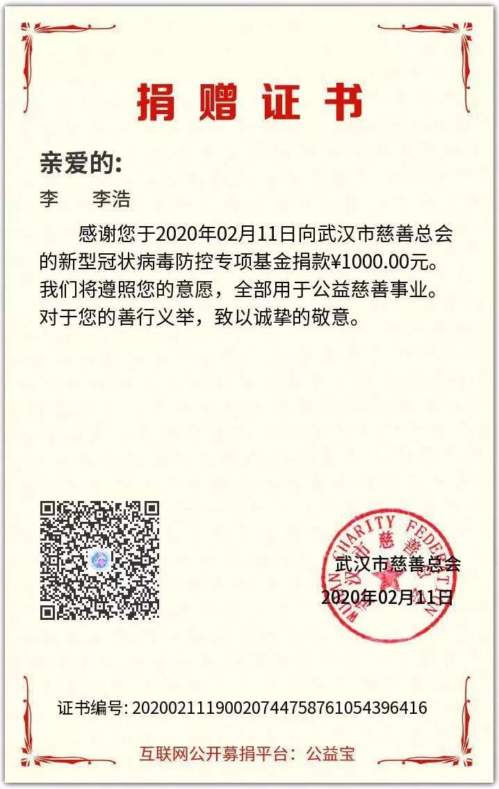 当疫情正逐步蔓延的时候我听到了党和海内外的华侨同胞的殷切期望并为之做出行动。从火神山医院用10天建成,到全国各地开展志愿,捐助医疗用品等个人和企业,我觉得我也应该行动起来了,便把自己的想法和自己父母说了,父母很赞同我,但是不能出门,待在家,我们便商量着捐出1000块钱,虽然这些钱不算多但是里面却包涵了们一家满满的爱心,当看到自己也能为祖国出一份自己的力量时候,我内心满是激动,尽力所能及之事为武汉助力!