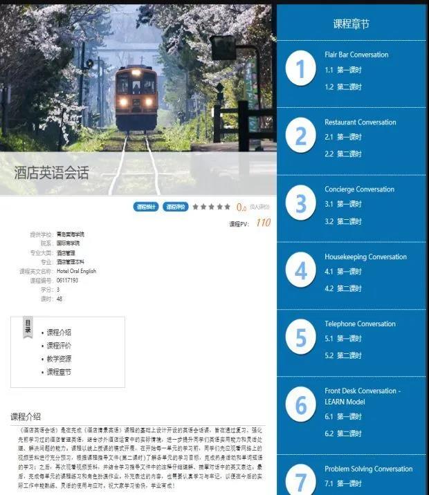 (一)学习通平台自建课程,根据万礼豪程提供的《酒店情景英语》(第二版)进行学习平台搭建,整个课程融合酒店的十大情景英语会话于十个单元当中,每一单元以会话视频的形式进行展示、配以学习指导资料、明确各单元的学习目标和重难点内容,来引导学生进行自主学习。本平台的教学偏重实践性,强调情景的模拟和对话的演练,要求学生在完成每个单元的学习后,视频上传自编的创意情景对话进行过程性考核,并以加权平均分的40%计入期末综合成绩,完成本课程16课时实践教学考核任务。