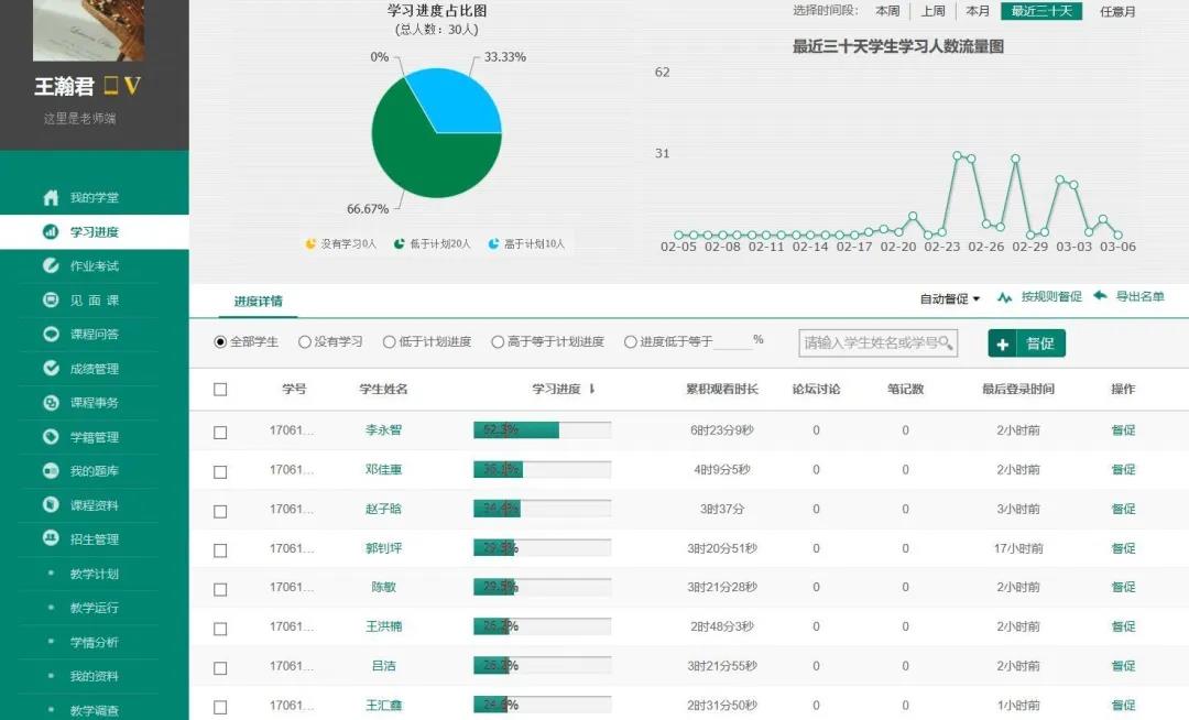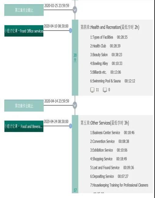 (二)智慧树平台《酒店英语》同步网课。为丰富和满足不同层次学生的需要,解决授课高峰期因网络拥堵而造成的单一平台登入困难问题,配套申请了智慧树平台《酒店英语》同步在线网课,以保障学习进程和效果。学生在完成每个任务点后,以闯关模式完成每一章节的学习内容和课后作业,教师可以在平台管理区实时监控学生的学习情况,对进度落后的同学及时予以后台催促提醒,保证班级进度的整体一致性。本平台的学习偏重理论性,最终成绩由平日20%、过程性测验30%、期末成绩50% 四部分构成,并以最终分数的60%计入期末综合成绩,以完成本课程32课时理论教学考核任务。