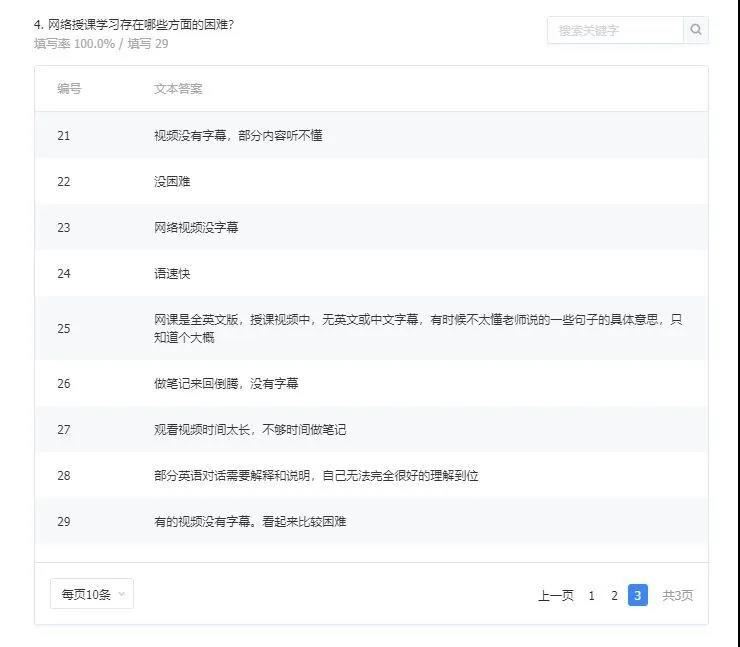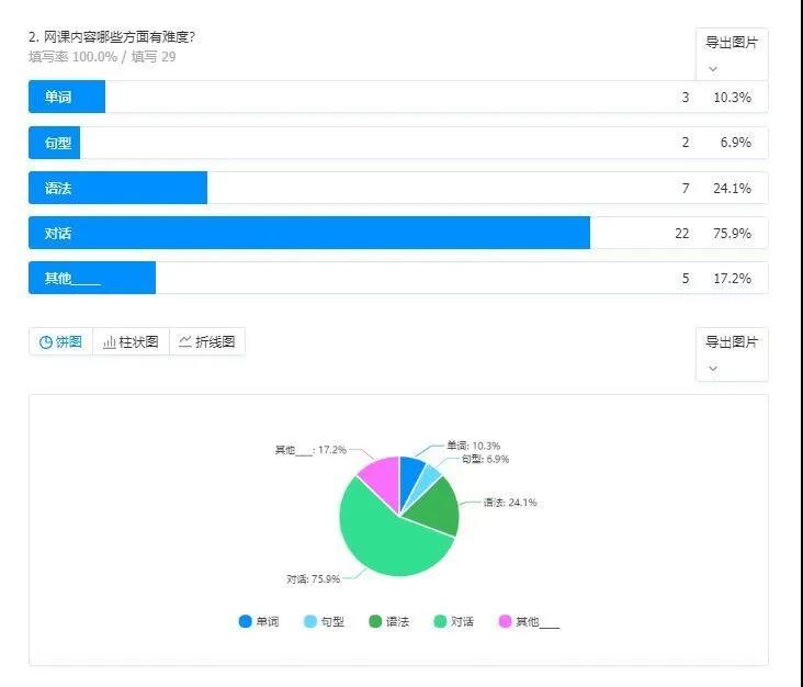 通过问卷反馈显示,班里学生的网络情况都能够支持视频的顺利播放,保证在线课程和自主学习的开展,七成以上的学生反应在线教学内容难度适中,另有接近三成的学生认为难度较大,通过进一步的调查发现,难点主要是视频英文对话的理解,因没有中文字幕而不能完全明白其中含意。