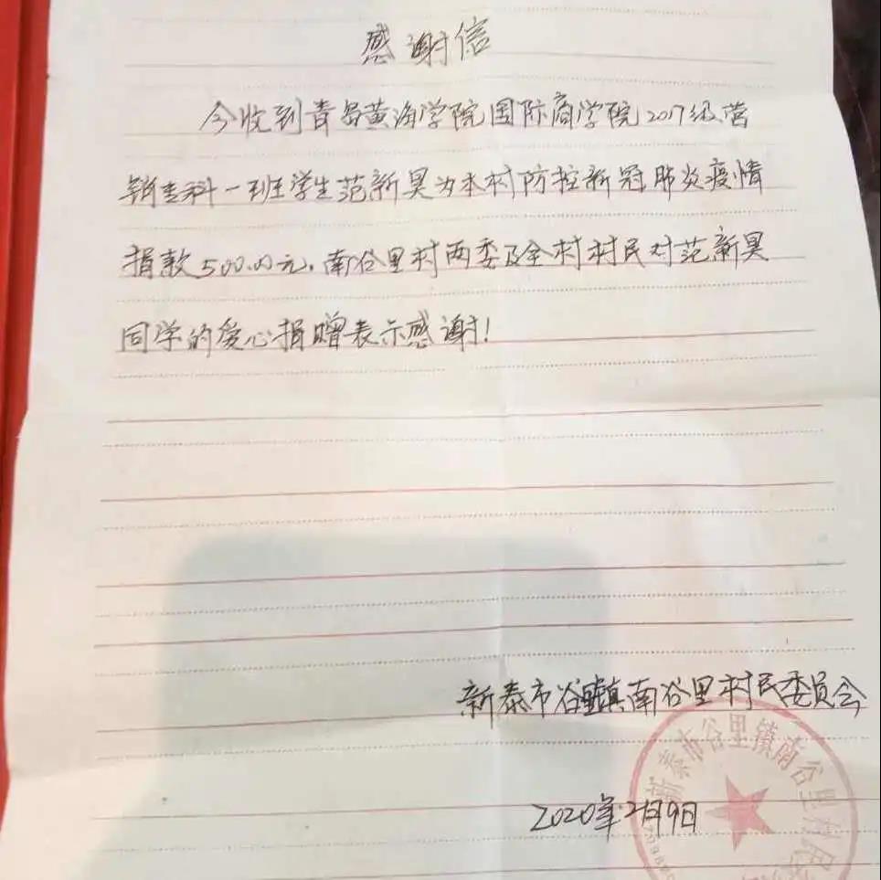 近日,19物本班的于邵田、19空乘2班的李浩、17市专1班的范新昊、19电本1班的刘金昊、18国本卓越班的李杭璕、19酒本2的姜欣羽、18物本班的李顺昌,这七名同学都以捐款的方式,贡献自己的青春力量,为抗击疫情添砖加瓦。