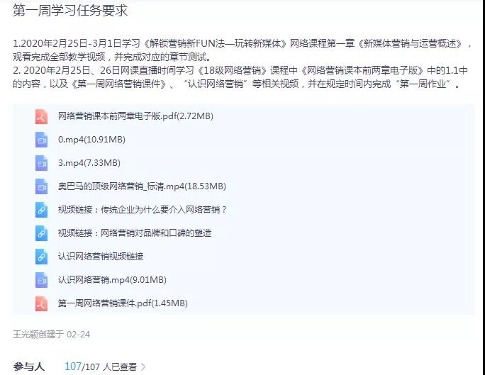 在每次上课前一天王老师会在《18级网络营销》翻转课堂中发布学习任务,要求学生在规定时间内完成相应的学习内容,教学任务还可以关联到对应的学习资源,方便学生参考学习。