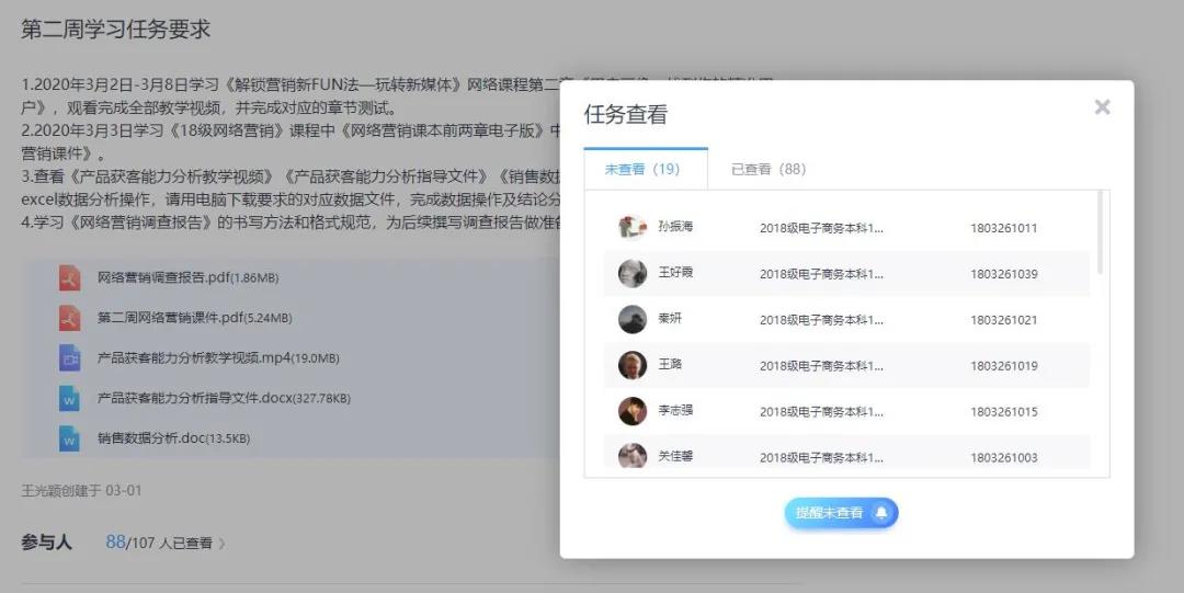 王老师提前准备好至少两周的教学资料上传至学习资料库中,包括课本电子版、授课课件、视频、参考资料等。在上课前一天将学习资源发布后,学生可以查看王老师共享的学习资料,红框处可以具体查看学生查看详情。