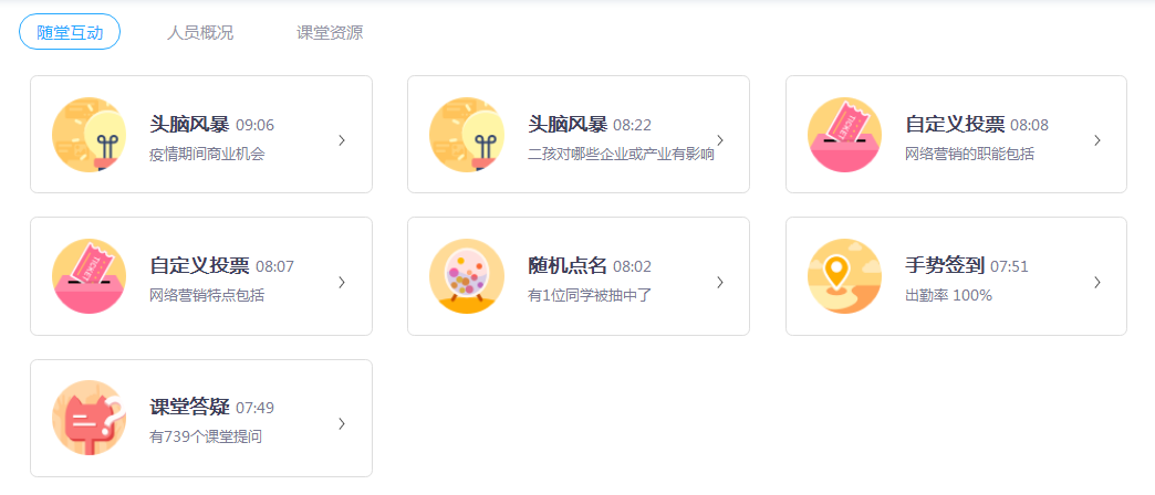 参与互动的学生可以获得课堂表现额外加分,并且每次见面课系统会生成课堂数据报表,王老师仔细查看学生的课堂表现,可以对参与互动较少的学生进行提醒或者下节课重点提问。