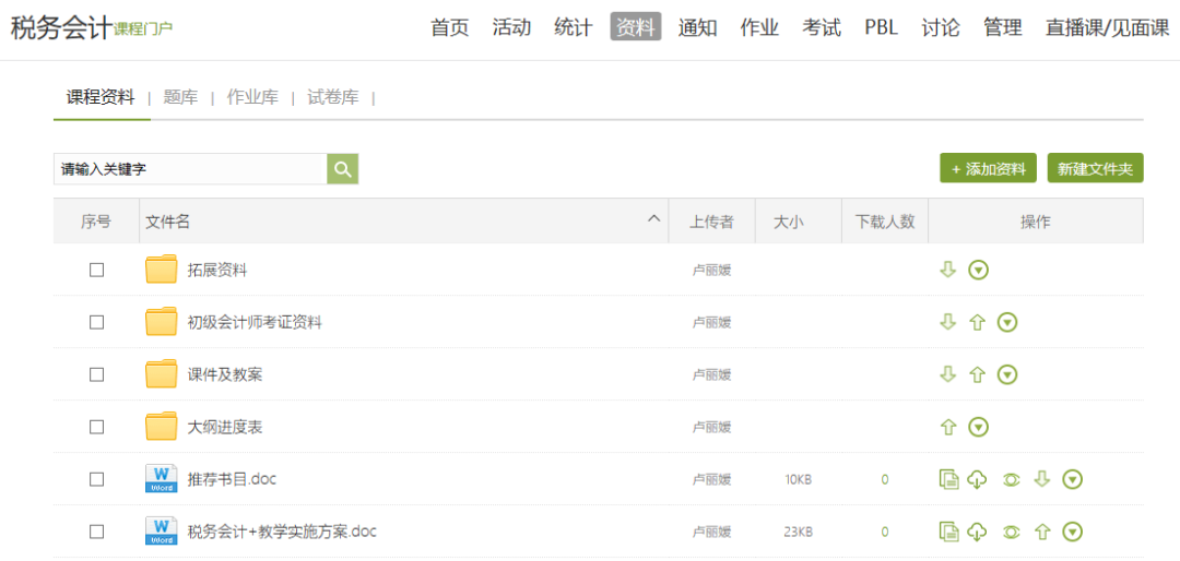 开课前,从出版社申请电子教材,最终选定由梁文涛主编,中国人民大学出版社出版的《税务会计》第三版图书作为备课主要教材。这本教材的出版时间是2020年1月份,是所有出版社关于《税务会计》科目出版时间最近的一本教材。因为税法近几年关于增值税和个人所得税的变动较多,这本书的内容更新到最新的税收规定,能够帮助学生掌握最新信息。同时,按照教材内容设计课件,准备练习题库,丰富课程学习资料,其中包括与初级会计师考试的相关资料,所有资料均提前上传学习通平台,方便学生课下预习和复习。