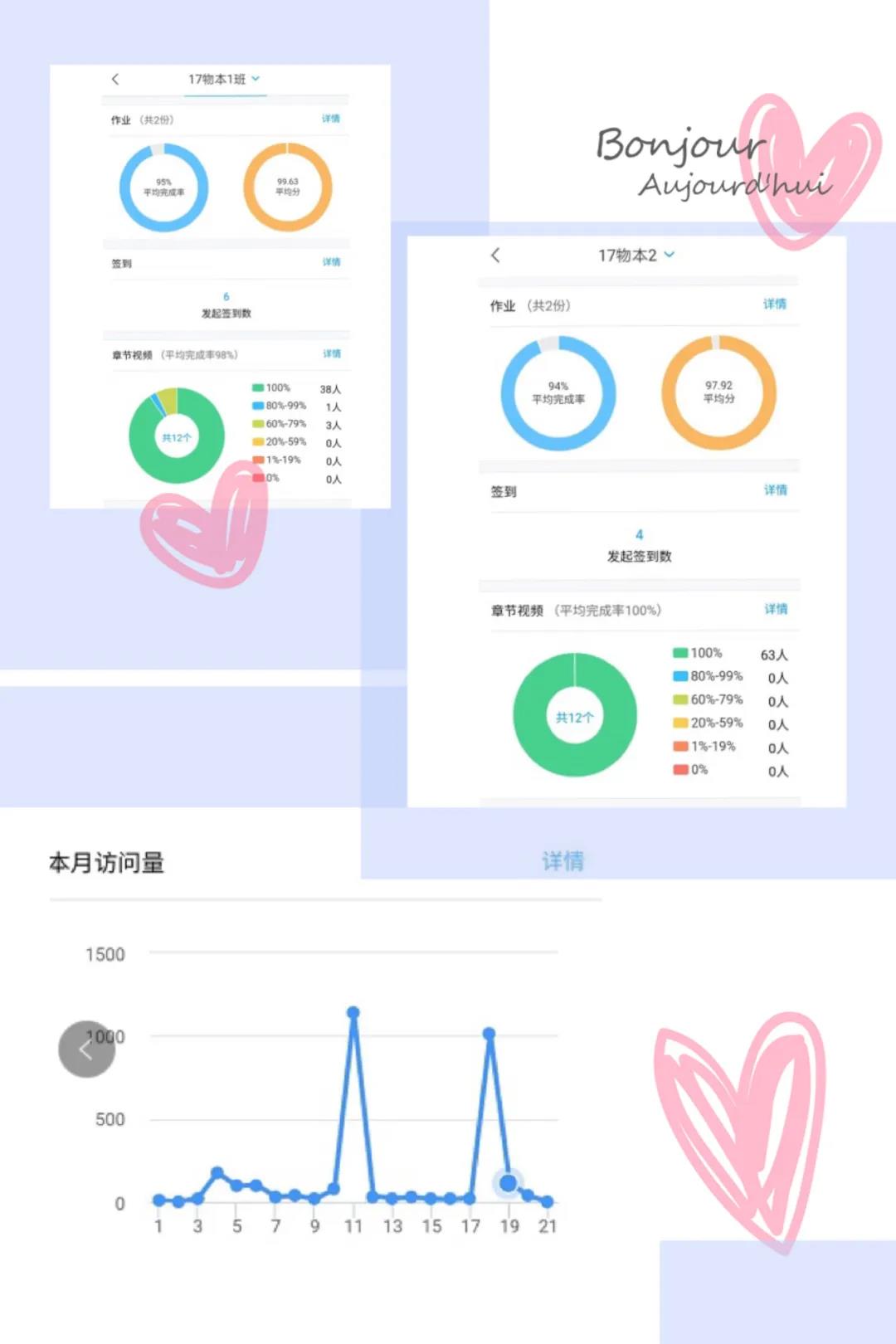 通过章节视频完成率可以看出17物本1班94%的同学完成了相关任务点的学习,17物本2班所有同学都完成了相关任务点,完成率达到了100%。通过完成率和访问量可以看出同学们积极认真的学习态度。