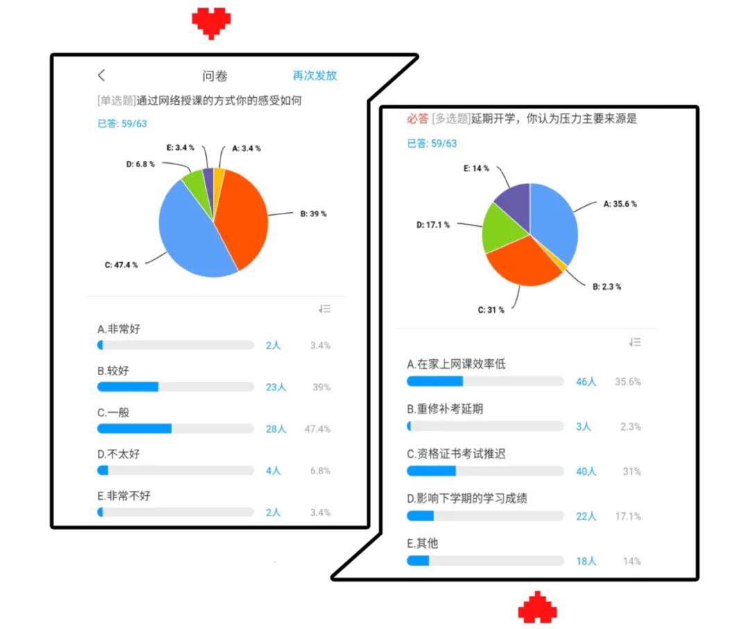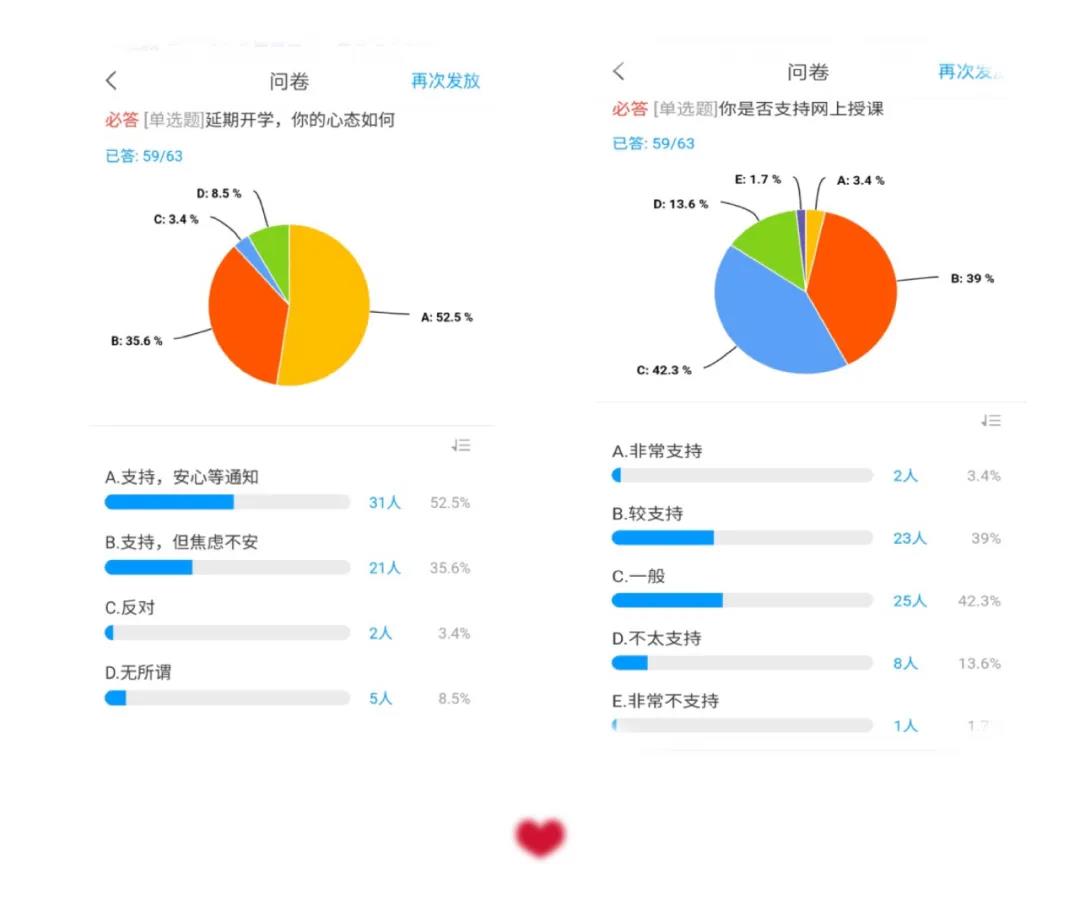 从调查中大家可以看出88%的同学是支持延期的开学的,只有3.4%的同学反对延期,但是有35.6%的同学在支持的同时还有些焦虑不安。84.7%的同学是支持上网课的,只有1.7%的同学非常不支持。