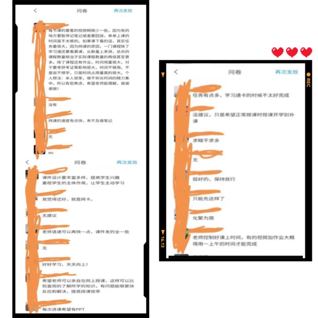 大部分同学反应比较好,也有一部分同学反映存在以下问题:个别学生由于考研或者考证等原因觉得辅助教学的MOOC平台的课程学习量有点多、多一些视频交流、由于网课没有停歇时间没法记笔记等。