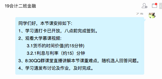 2020年,一场突如其来的疫情,打乱了我们原有正常的上课计划,给我们“送来了”一个“加长版”寒假。而作为教师的我们,也迎来了更大的挑战——用直播录播等形式进行网络教学。在2019级会计专科《金融理论与实务》的课程中,我主要采用“学习通+QQ”的形式进行线上教学,以“中国大学MOOC”为辅助教学工具,并用QQ群进行消息的传达及课后答疑解惑。