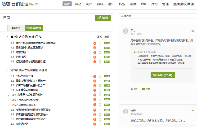 本人所带的课程《酒店营销管理》 采用了学习通平台+QQ群的形式进行。现就本课程的线上教学情况做简单介绍。