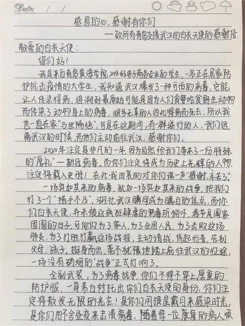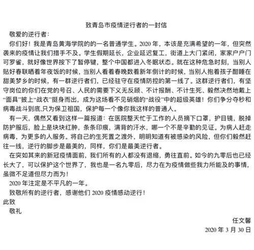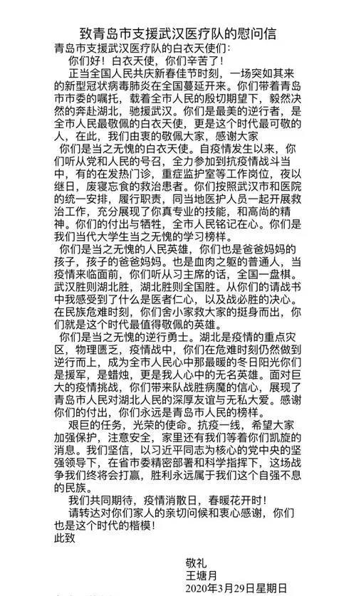 面对新型冠状病毒肺炎疫情,岛城全民总动员,齐心协力奋勇抗“疫”这其中有奔赴“疫”线、勇往直前的广大医护工作者;有坚守岗位、尽忠职守的公安干警、党员干部;有大爱无疆、热心助人的社区志愿者;还有翘首期盼、望眼欲穿的父母、夫妻和孩子。连日来,一封封来自抗“疫” 一线的“家书”、“请战书”、“决心书”、“慰问信”、“感谢信”在网上刷屏。“见字如面”,非常时期,乙亥末,庚子春,疫情发,染者数万,医护人员们坚守在一线,全国人民同舟共济,誓要打赢这场防“疫”战,他们在一线默默无闻地奋斗,守护每一家的团圆,但在他们身后还有一个家。见字如面,纸短情长,疫情时刻,一封封家书用最朴实的方式,诉说着一个个平凡英雄内心深处的真情与大爱。