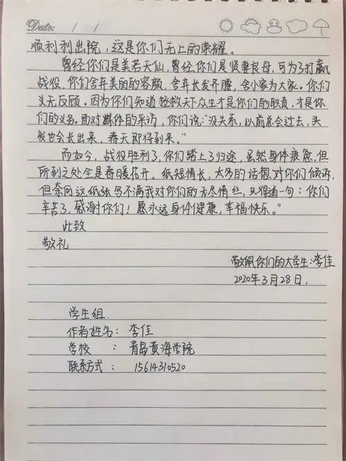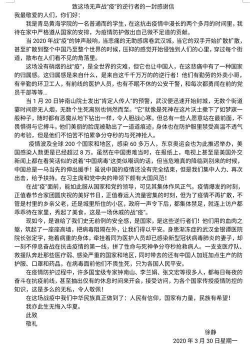 在这个战疫时刻,没有什么比一封最传统的“书信”更能表达内心炙热的情感。这些书信里有父母的叮嘱、有孩子的期盼、有医护工作者的庄严承诺,有学校老师的殷殷关爱……见字如面,纸短情长。危难时刻,一封封抗“疫”的家书,用最朴实的方式,诉说着一份牵挂、一份祝福、一声加油、一句嘱托。这些黄海学院写给抗“疫”父母的家书,读后让人泪流满面!