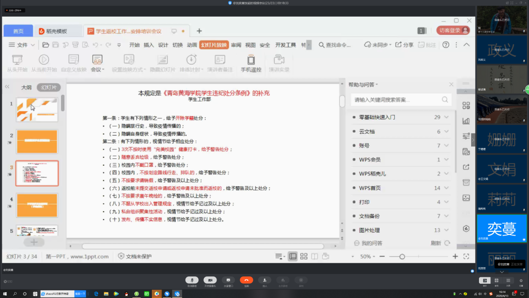 会议上,对"学生返校工作和日常防控工作"等一系列文件进行了学习。要求各个辅导员贯彻落实细节,认真详实的开展工作,要做到摸清家底、严格把控、细化分工、明确责任。希望全体辅导员在认真落实工作的同时,积极迎接4月15日学校疫情防控领导小组学生工作组所组织的"学生返校工作和日常防控工作安排"考试。