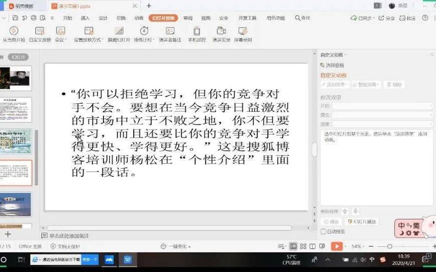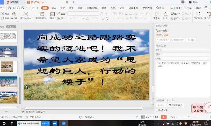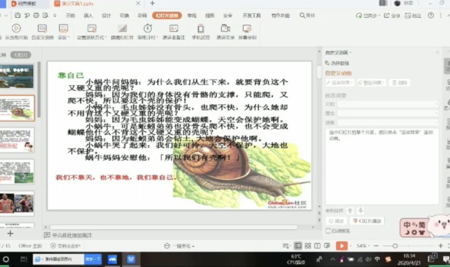 4月21日,19级商务英语本科2班全体同学参加了“学会生活,学会学习”主题团课。班会开始前,蔡姣姣同学向同学们讲了关于《小蜗牛》、《钓竿和神迹》的故事。这两个故事让同学们明白了凡事需要靠自己,不能只坐享其成,要努力活出精彩的自己,使自己的生命更加有意义同时又充满了亮丽与光彩!