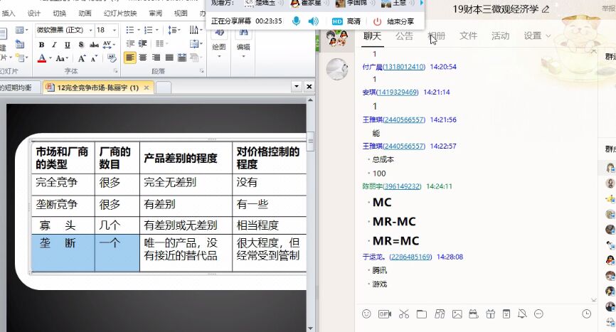 《微观经济学》课程已经完成了近一半的学习任务,在过去八周的授课过程中,我们不断改进授课方式,在原有的“学习通录播+学习通课堂互动+QQ群课堂”方式的基础上,增加了QQ屏幕分享的使用,在讲授过程中学生可以随时提问,提高了直观性和时效性。根据截至目前的学习情况分析,学生能够按时完成签到、讨论、作业、视频学习等任务,到课率达到100%,在每节课回顾重点时掌握情况也良好,能够实时掌握学生动态是网络教学最大的优势。