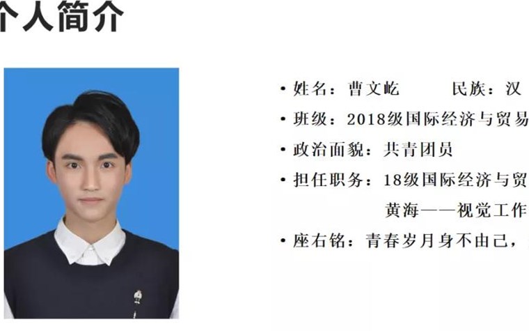 此次评优在重重审核下,国际商学院的两名同学以突出的贡献、极具感染力和代表性的事迹,凭借优秀的评选条件入选为青岛黄海学院2019年度“荣耀黄海”十佳优秀学生。