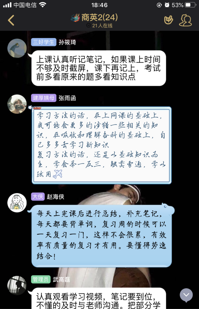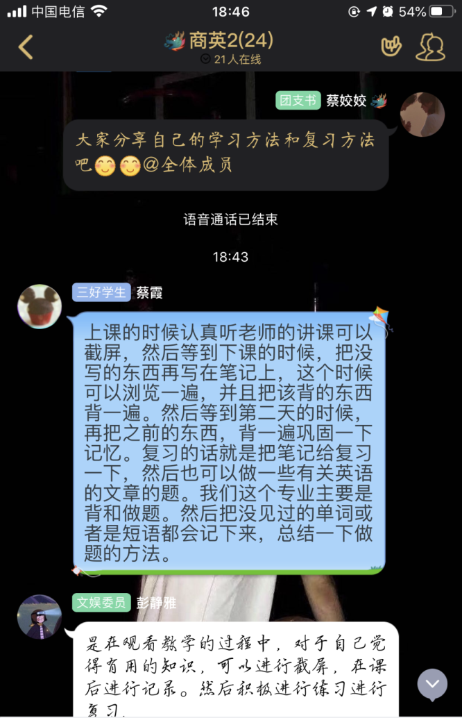 古语有云:“我非生而知之者,好古,敏以求之者也。”期中考试刚刚结束,19级商务英语本科2班的全体同学参与了“分享学习经验”的主题班会,同学们一起分享了自己的学习经验,收获颇多。