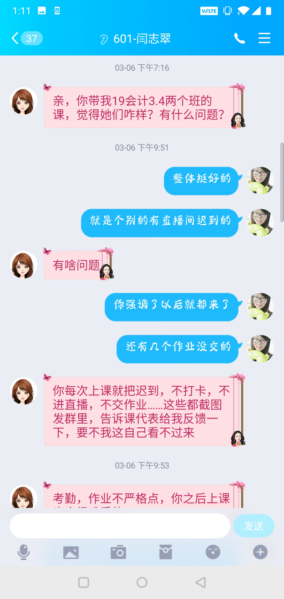 此外,第二个问题是学生的执行力不强。每次上课我都发现,同学们好像特别“听话”,他们会在直播间很积极的回复“1”,他们也会第一时间回复“在”,但当提问时会发现好像没有学过一样,每次的作业都有几个未交的,视频都有未观看的。这种问题处理好像有点棘手,每次作业总是有几位同学不完成作业,以前在学校可以面对面的督促他们完成作业,但现在鞭长莫及,只能挨个发信息打电话进行督促,效果不明显。