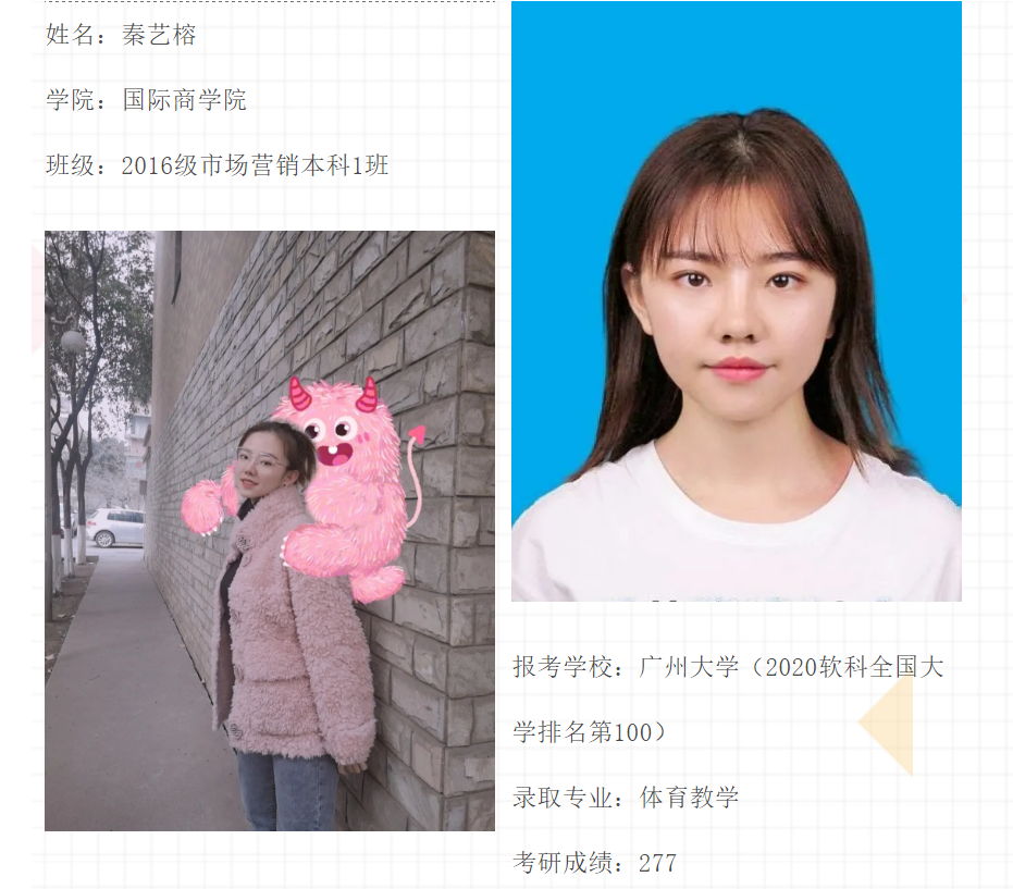 其次要经常给自己加油打气!也可以找一个积极向上的考研好友。在考试之前保持良好的心态,轻松愉悦的迎接考研初试。在考试前不要怀疑自己的专业能力!可以和同学互相加油打气,互相督促!相信自己,不要跟别人比较,不要妄自菲薄,你只需要战胜你自己,比昨天的自己更努力一点。在整个备考过程中,我认为心态的调整极为重要。让你感觉自己坚持不下去了,找你信任的家人、朋友、老师聊一聊,他们的支持会帮助你渡过难关。我非常感谢我的班导薛栋老师,从决定考研、到最后成功录取,他都细心关注班里的每位成员。尽他最大的能力,为我们争取学习时间、学习环境、学习资源!同学们,有任何事情都可以和自己的辅导员讲,辅导员是和父母一样希望你未来越来越好的那位存在!老师们真的是从心底把我们当成自己的孩子和弟弟妹妹看待。