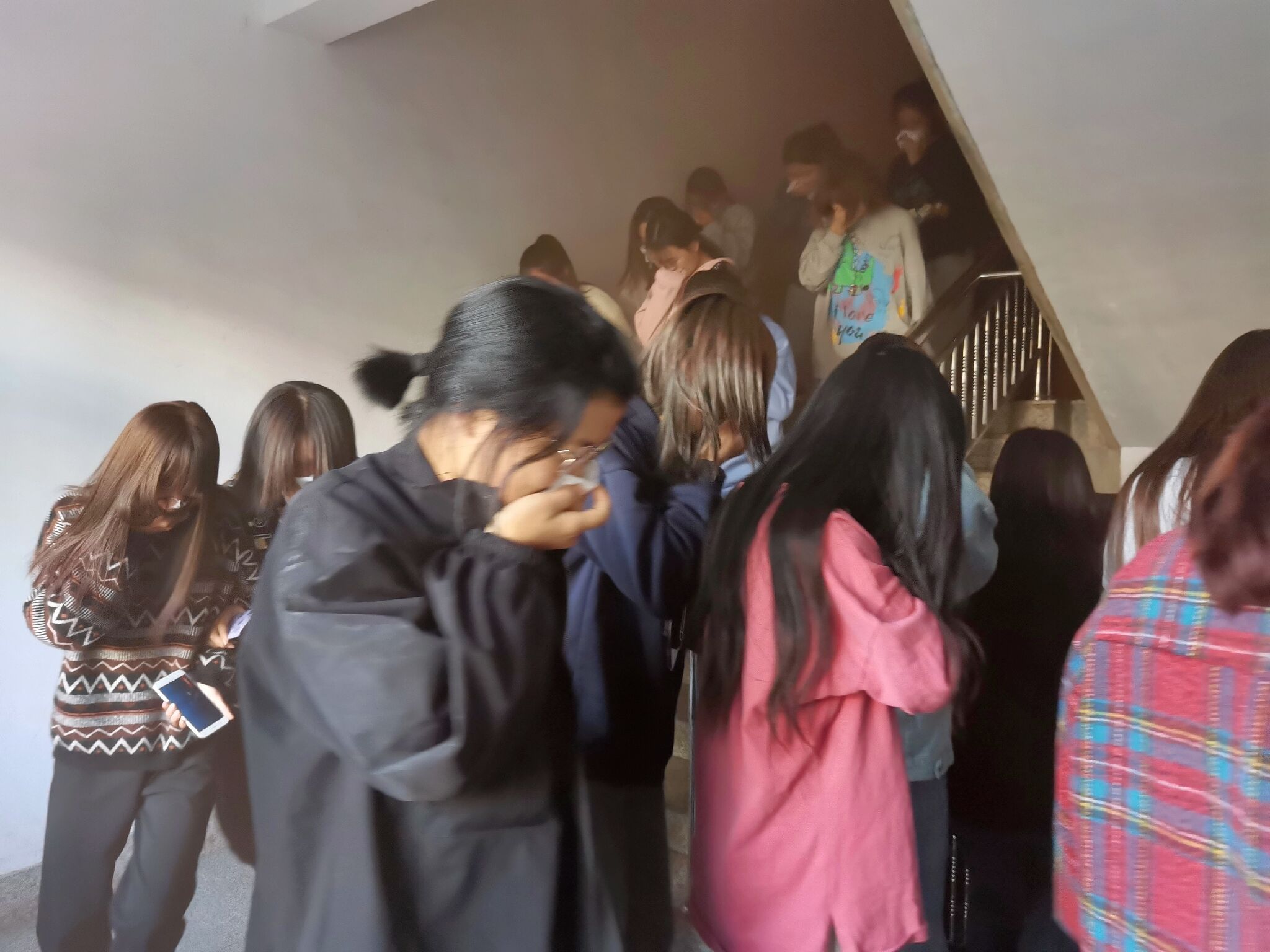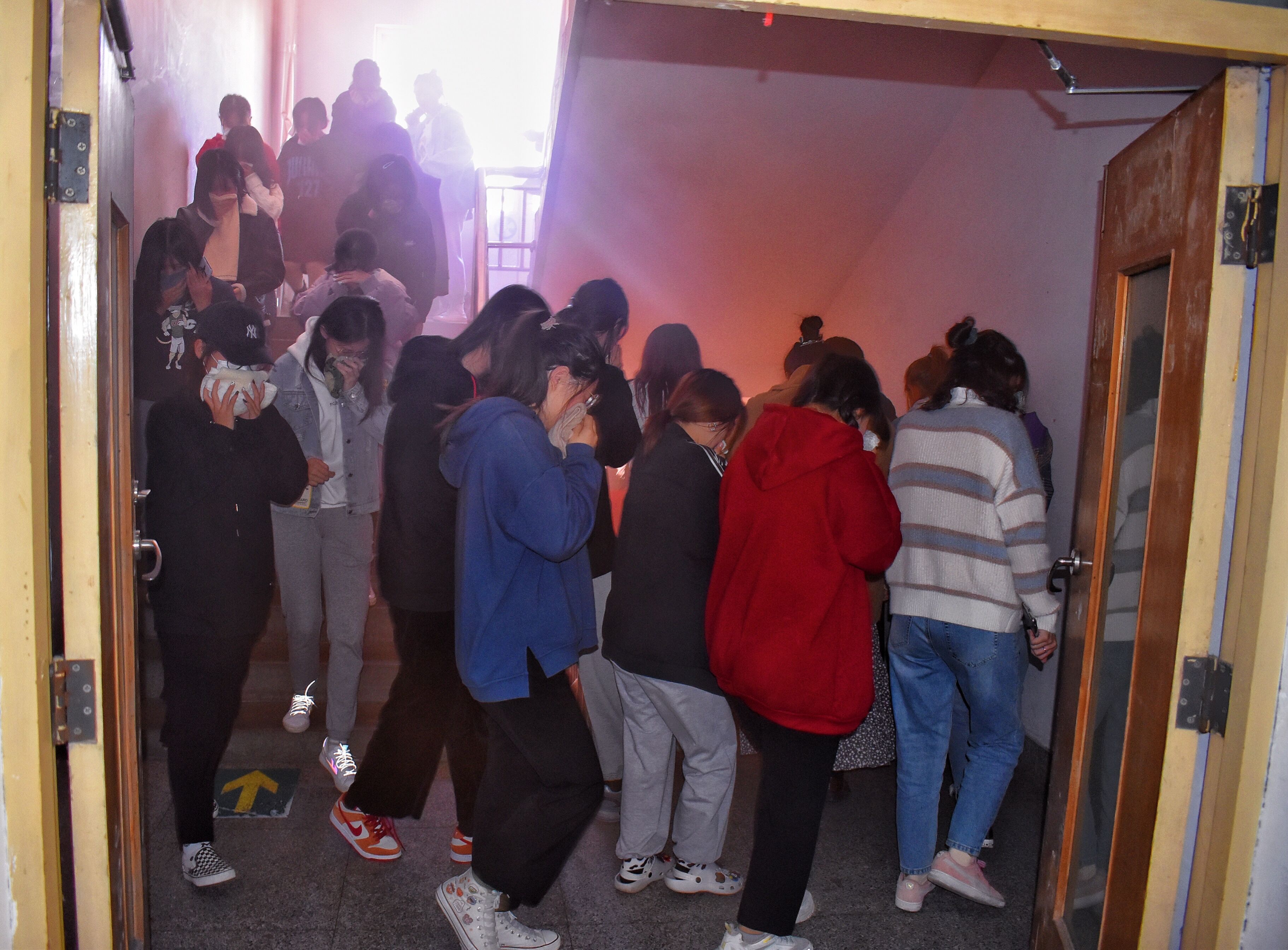 演练前,我院领导及学生干部对演练步骤、疏散路线和注意事项等进行了周密的部署。指挥人员提前到达指定位置,为大家指挥撤离路线。警报拉响,参加演练的同学们用湿毛巾捂住口鼻,将身体放低,快速有序地撤离宿舍楼。整个撤离过程历时2分28秒,总计疏散554人。