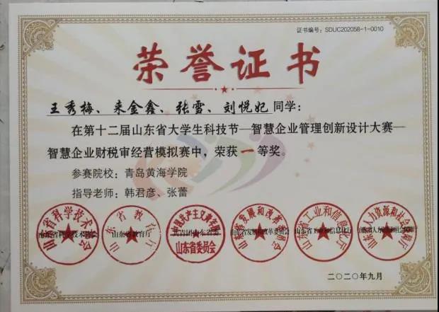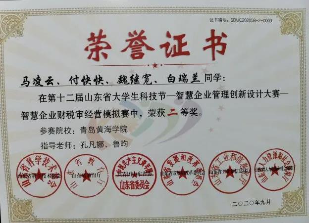 青春在奋斗中展现美丽。2020年9月中旬,由山东省科学技术协会、山东省教育厅等六个单位联合举办的财税审经营模拟大赛完美落幕。我校国际商学院财务管理专业的四支代表队积极参与其中,并最终荣获一等奖3项、二等奖1项。