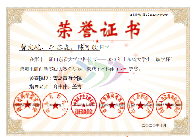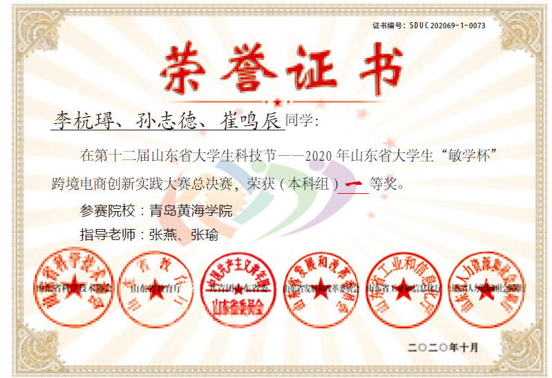 2020年由山东省科学技术协会、山东省教育厅、共青团山东省委、山东省发展和改革委员会、山东省工业和信息化厅、山东省人力资源和社会保障厅联合主办的“第十二届山东省大学生科技节跨境电商创新实践大赛”完成了山东省总决赛网络选拔赛(2020年9月25号—27号远程在线举办)和山东省总决赛现场赛(本科组于2020年10月16号—18号完成,高职高专组及中职组于2020年10月23号—25号完成)两个阶段的激烈角逐。