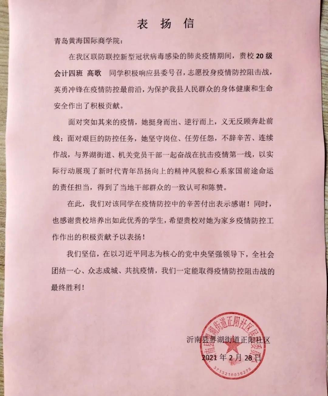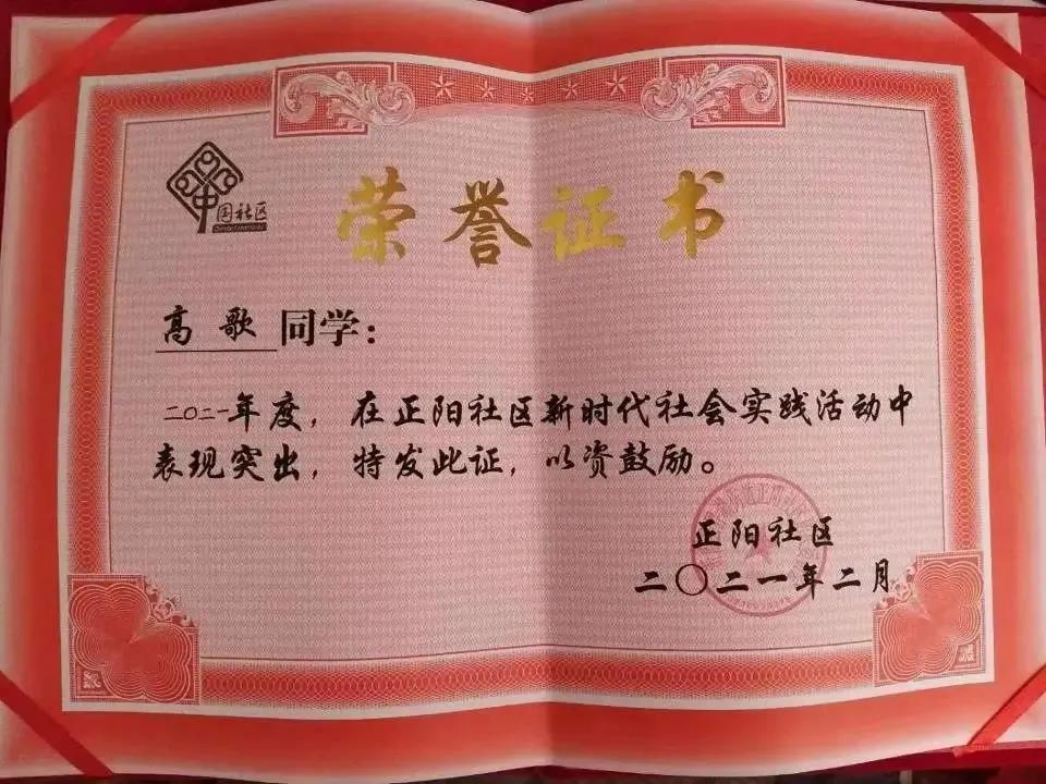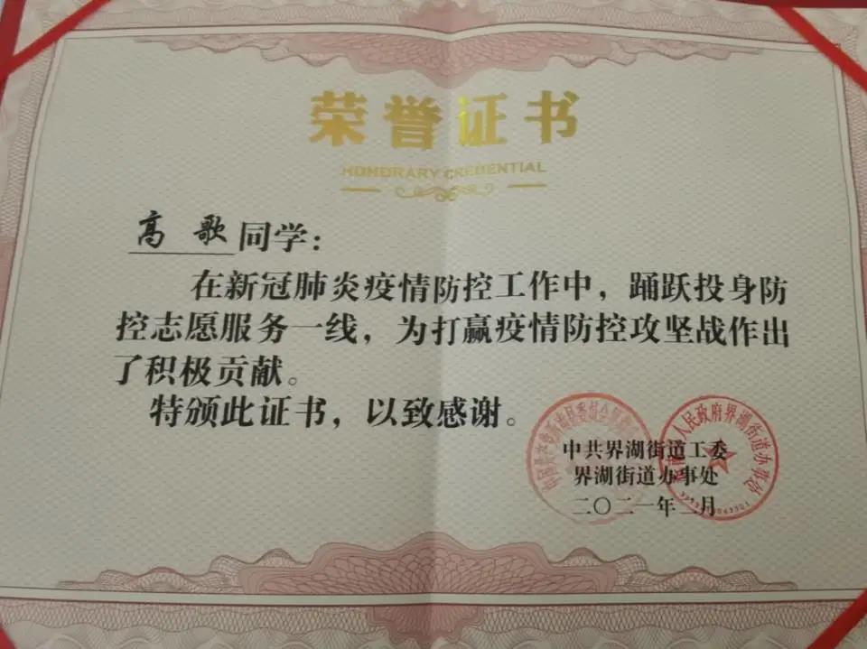 2020级会计四班的高歌同学在寒假期间协助社区的防疫工作,探望中华人民共和国成立前老党员,外出采集住户信息,并负责制作登记表,参与社区的疫情演练等活动。高歌同学说:“我希望用我微薄的力量,让身边的人不再感到对疫情的恐惧,让这个新年更加欢乐,美好。”