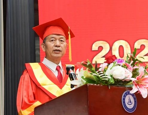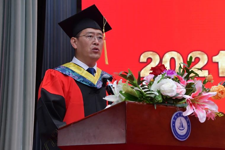 校长王渊明在毕业典礼上致辞,他提到过去几年,毕业生们克服了学业困难,经历了疫情大考,接受了成长洗礼,经历了从青涩懵懂到成熟自信的华丽转身。王校长向全体毕业生提出三点希望:志存高远,以蓬勃向上的面貌迎风起浪;脚踏实地,以恒久拼搏的姿态劈波斩浪;勇立潮头,以时代发展之驱动乘风破浪。王校长深情告诉毕业生:“黄海永远是你们最温暖的家,永远是你们的心灵港湾和坚强后盾,欢迎你们常回家看看!”