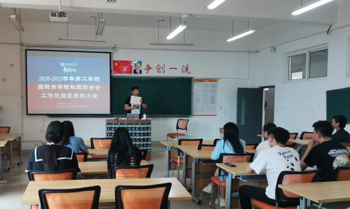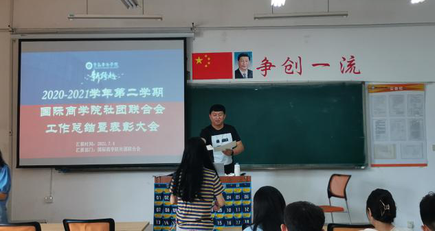 2021年7月4日上午,国际商学院社团联合会于知诚楼103举行了2020—2021学年第二学期工作总结暨表彰大会。会议由薛栋老师主持,国际商学院十九位社团会长及两名社团联合会负责人参加了本次会议。