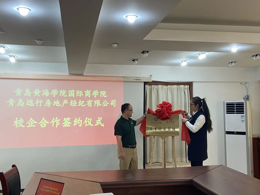 青岛远行房地产经纪有限公司代表周星、张广超与我校国际商学院副院长孙守强、财会金融系系主任姜作鹏、系副主任孔凡娜共同出席了签约仪式和校企共建人才培养基地揭牌仪式。校企双方表示,在“优势互补、资源共享、互惠双赢、共同发展”的原则指导下,积极探索在人才培养、产学研究、实习实训、师资共建等多领域的合作,共同培养高素质的应用型人才,服务地方经济发展。