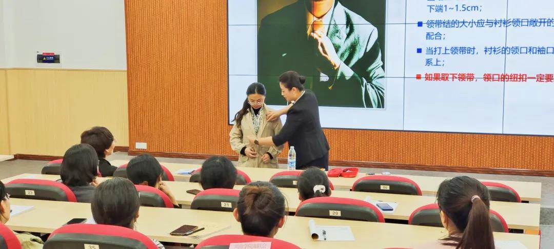 李老师在培训中重点谈及礼仪的根本——尊重他人。她强调:符合职业身份的穿着打扮都是对他人尊重的表现,同时也代表着黄海学院的学校形象。教师职业具有典型的示范性特征,教师的一言一行,一举一动都是学生学习的榜样。“礼由心生,仪由外表”,教师得体的着装不仅给学生美好的印象,还能展现教师的教学风格,影响着教学效果。整个培训过程中,李老师还通过大量的现场示范活跃学习气氛,调动参训教师们的积极主动性,从而使每位参训教师在轻松愉悦的氛围中加深了对教师礼仪知识的了解,掌握了许多实用性极强的教师礼仪知识。