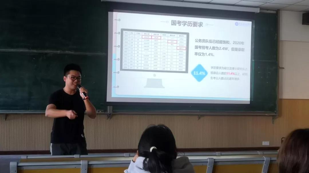 在培训的第二个环节中,继续教育中心负责考研指导的王延龙老师用风趣幽默的风格首先为同学们分享了自己的考研历程和心得。在培训过程中与学生多次互动,调研了解学生们毕业后的求职意向和考研动机。王老师为学生们解读了考研的重要性和就业前景。