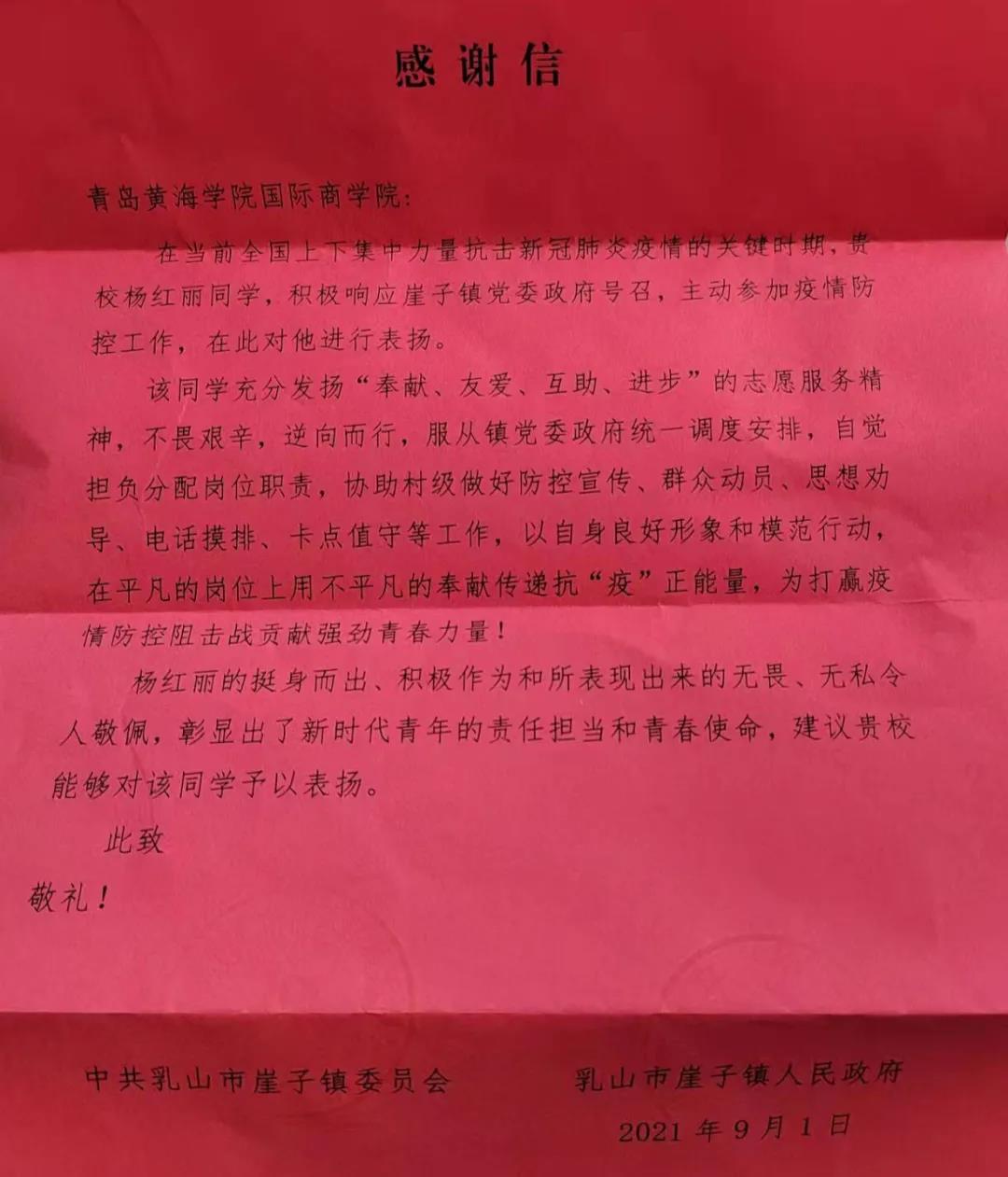目前,疫情防控工作更加深入人心,正是全国上下集中力量抗击新冠肺炎疫情的关键时期,我院杨丽红同学积极响应并主动参加崖子镇党委政府的疫情防控工作,于此得到了乳山市崖子镇人民政府的高度赞扬。