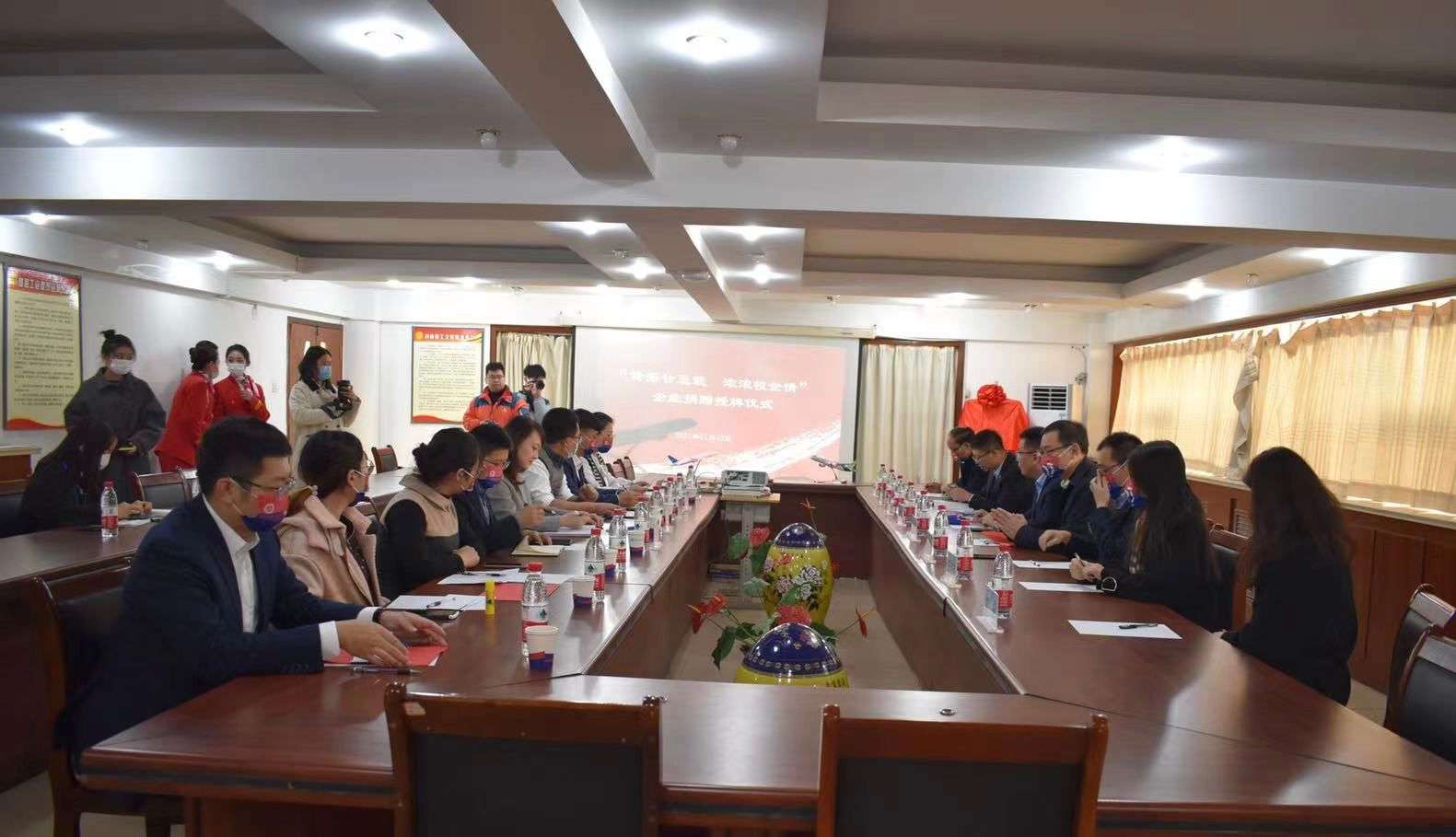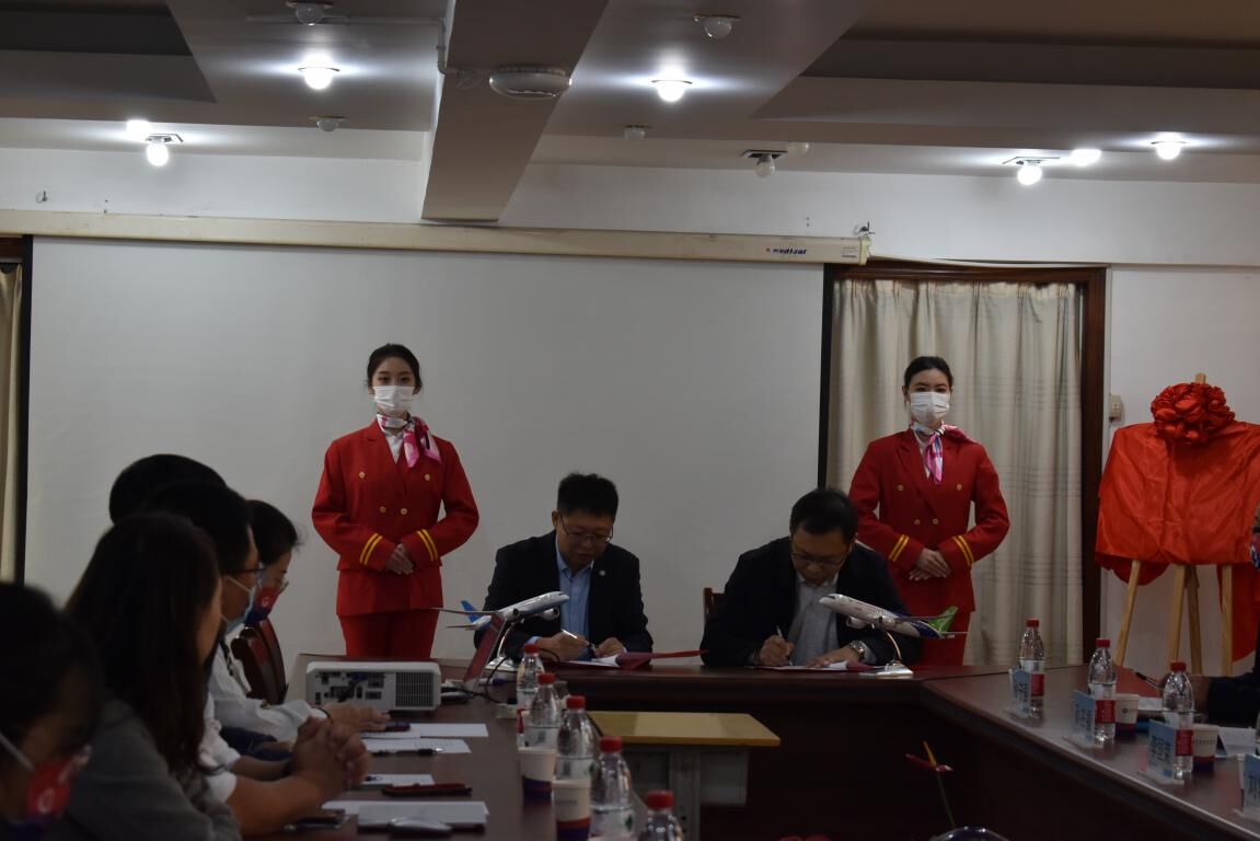 在青岛黄海学院25周年校庆之际,为加强校企合作深度发展“北京华航校庆捐赠及双创基地授牌仪式”于2021年11月12日在知新楼二楼会议室举行。参加本次会议的有青岛黄海学院国际商学院常务副院长孙在福、青岛黄海学院国际商学院教学副院长孙守强、北京华航航空服务有限公司副总经理温振军 、北京华航航空服务有限公司山东教育基地主任贾庆法以及各位教师代表。