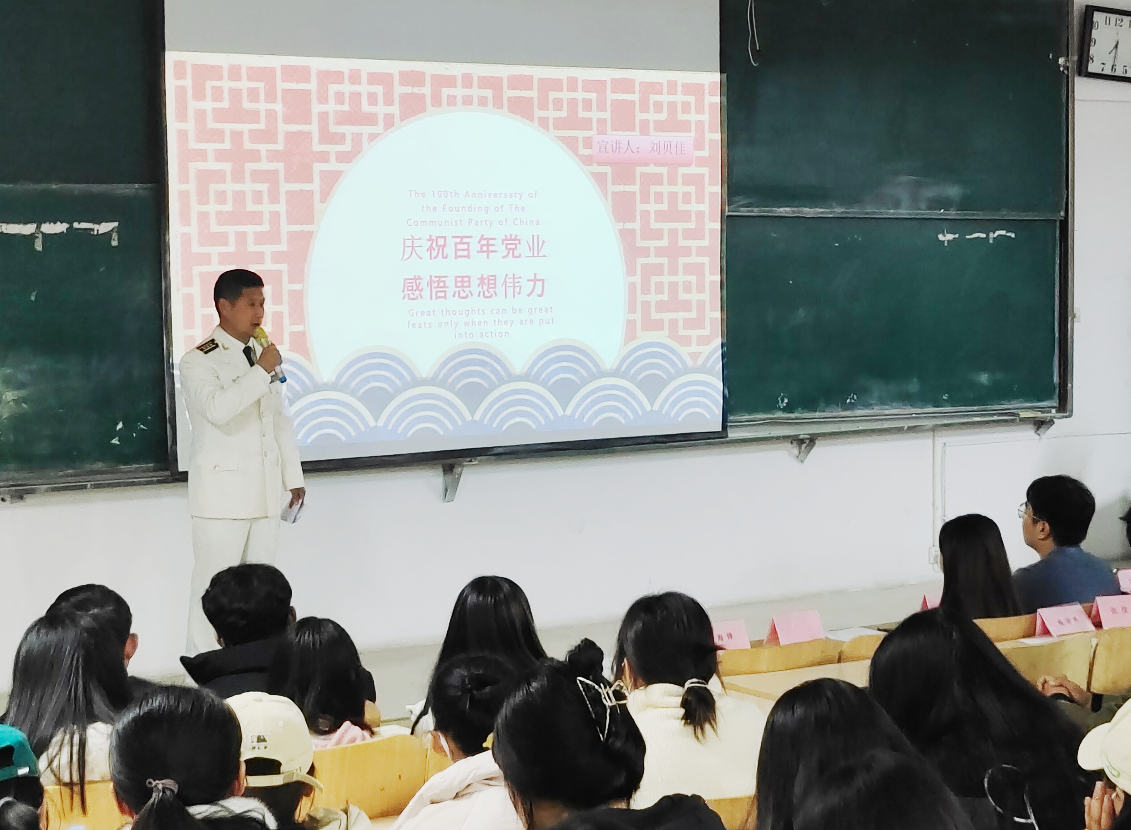 会议伊始,高海锋主任发表讲话,他身着一身军装,英姿飒爽。他首先阐释了开展红色宣讲会是为丰富同学们的生活,引领学子在学思践悟中坚定自己的理想信念,切实将培育和践行社会实践、社会主义核心价值观落实到日常生活中。最后他也分享了一句习近平总书记的话:“新时代的中国青年要以实现中华民族伟大核心为己任,增强做中国人的志气、骨气以及不负时代,不负韶华,不负党和人民的殷切希望。”
