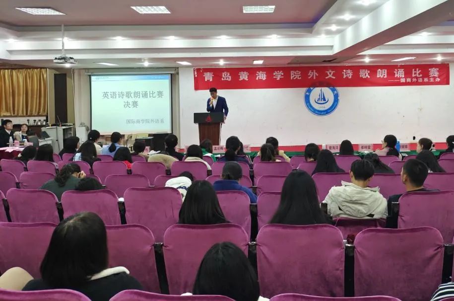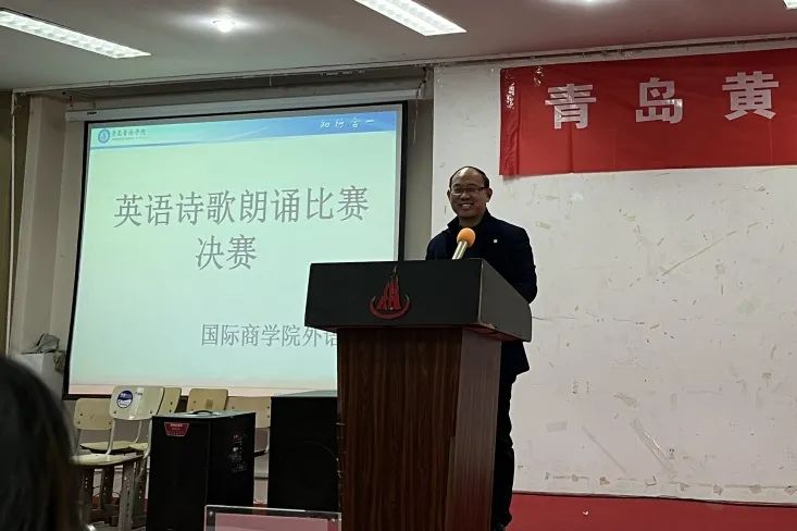 首先是国际商学院副院长孙守强致开幕辞,孙院长讲到:此次朗诵比赛不仅是对建党100周年的献礼、对青岛黄海学院25周岁的生日献礼,对所有人而言更是一次精神上的洗礼和思想上的升华;国际商学院自2020年起坚持走“八亦”路线,即:亦校亦企坚持校企合作,亦儒亦商坚持中国优秀传统文化与商科教育相结合,亦中亦西坚持中外合璧和中外交融,亦教亦学坚持教学改革;本次外文诗歌朗诵比赛充分体现了八亦”,希望通过这次比赛,能进一步提高同学们的外语能力和朗诵水平、进一步激发全校师生学习外语的兴趣和热情,希望同学们能不懈地努力,不断地挑战自我和战胜自我,并在本次比赛中取得优异成绩。